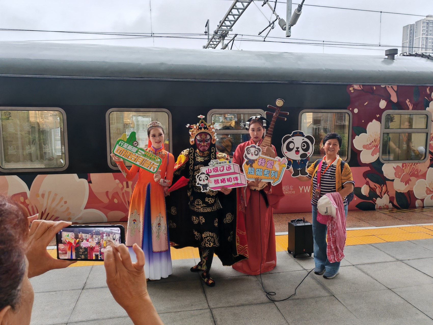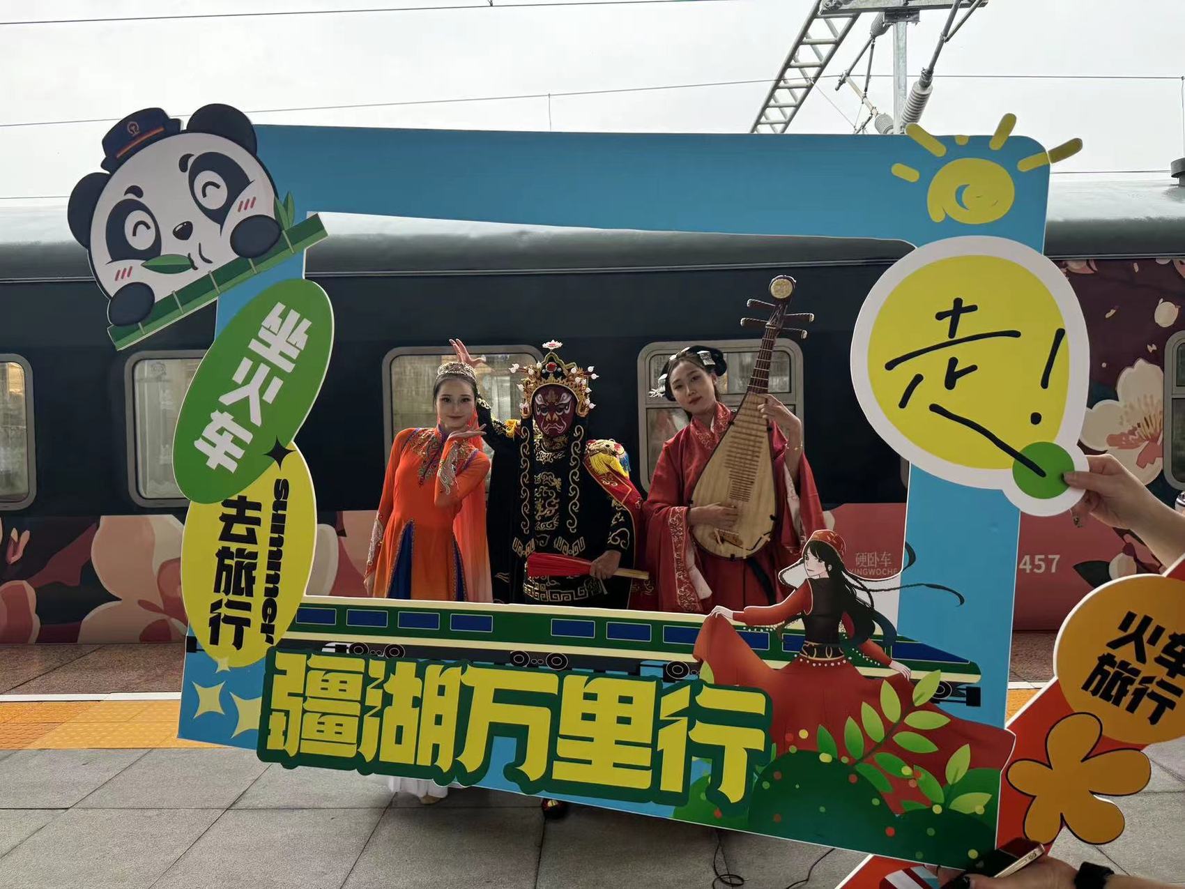 今年暑运期间,“熊猫专列”持续开行“疆湖万里行”新疆主题全景深度游,带旅客畅游新疆。为了提升旅客出游体验感,当天开行的“熊猫专列”首次携手四川省川剧院、四川省锦城熙剧院、著名乐团等带来“巴蜀文化耀熊猫”川剧变脸、新疆歌舞、琵琶弹奏等丰富列车活动。