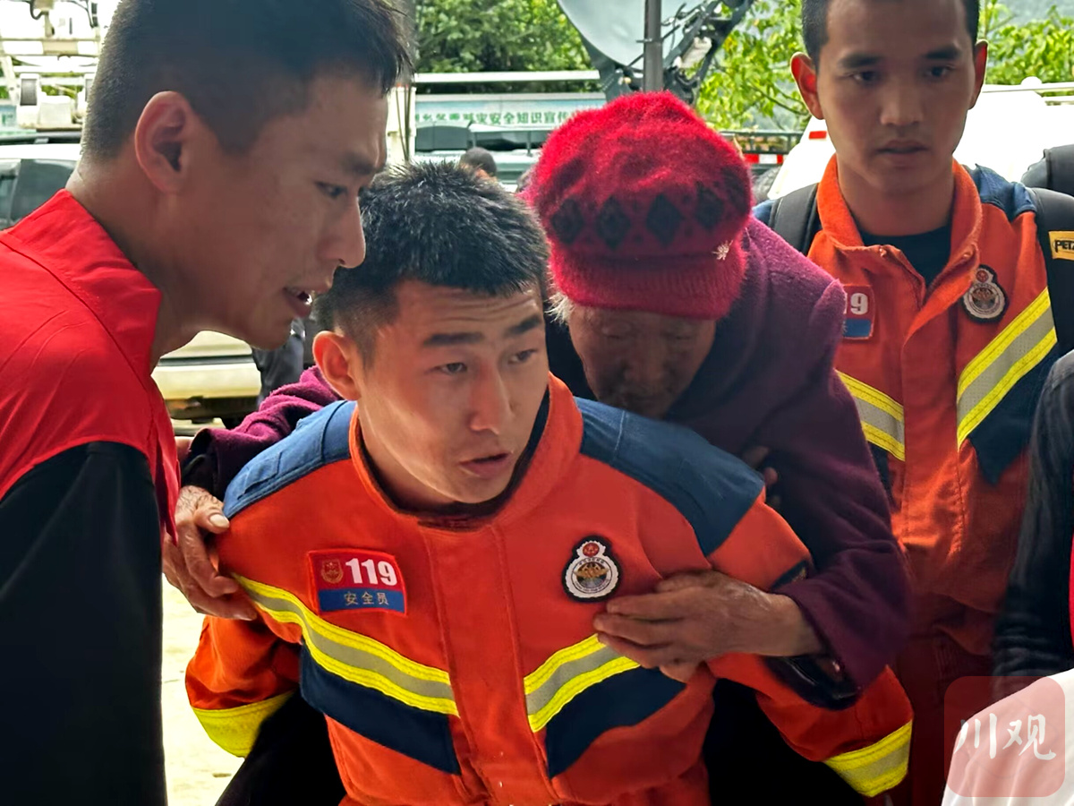 7月21日10点55分左右,汉源县马烈乡新华小学安置点外,传来一阵阵呼喊声:“请大家让一让。”只见一群年轻的消防队员满头大汗,背回来两位80多岁高龄的老人。