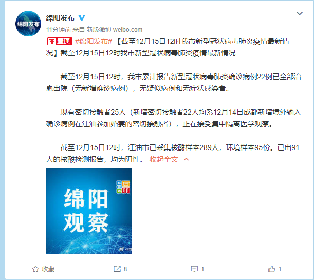截至12月15日12时,绵阳市累计报告新型冠状病毒肺炎确诊病例22例已全部治愈出院(无新增确诊病例),无疑似病例和无症状感染者。