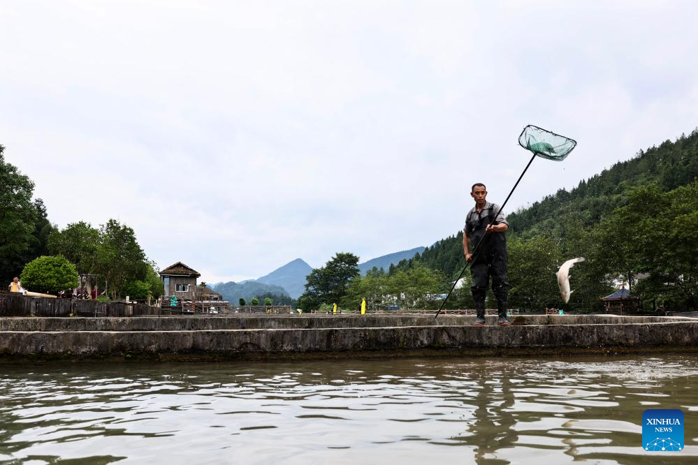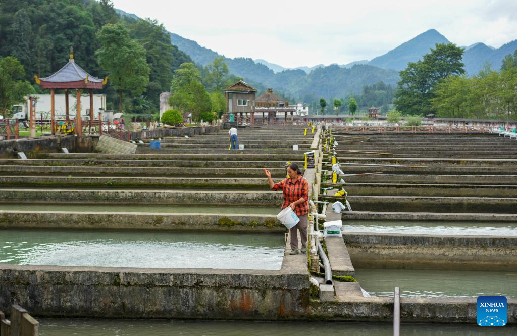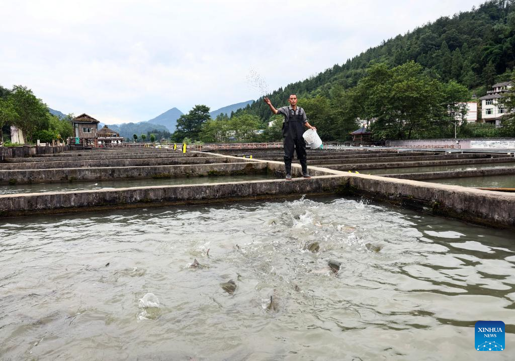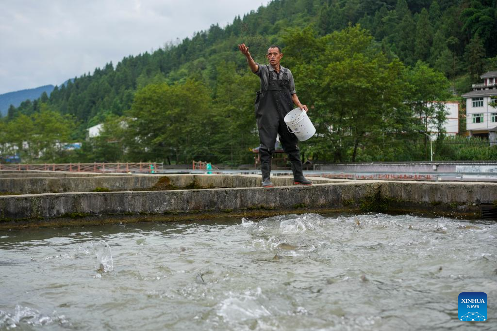 A villager feeds cold-water fish at a breeding base in Quyang Village, Taiyuan Township of Pengshui Miao-Tujia Autonomous County, southwest China's Chongqing, July 19, 2024.