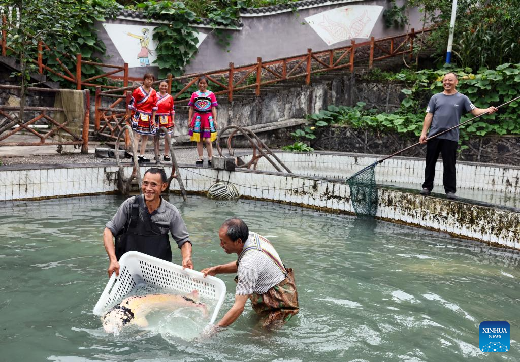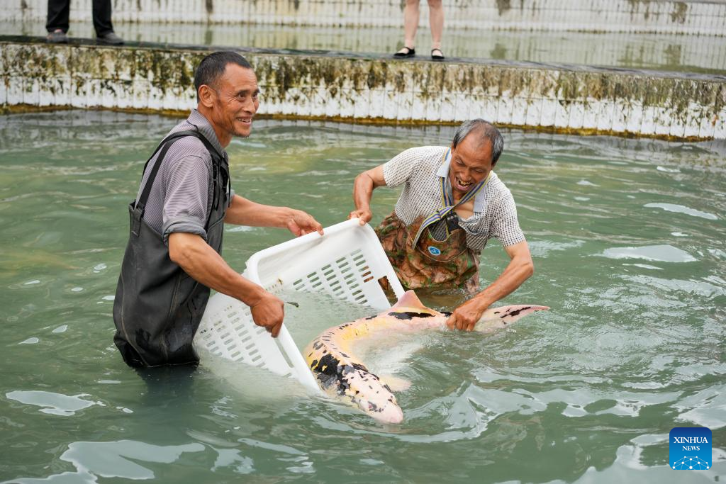 Villagers check the growth of a sturgeon at a breeding base in Quyang Village, Taiyuan Township of Pengshui Miao-Tujia Autonomous County, southwest China's Chongqing, July 19, 2024.