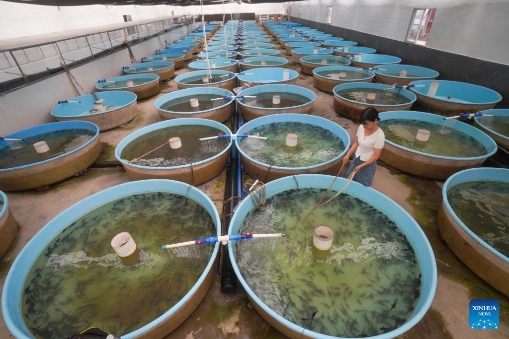 A villager works at a breeding base in Quyang Village, Taiyuan Township of Pengshui Miao-Tujia Autonomous County, southwest China's Chongqing, July 19, 2024.