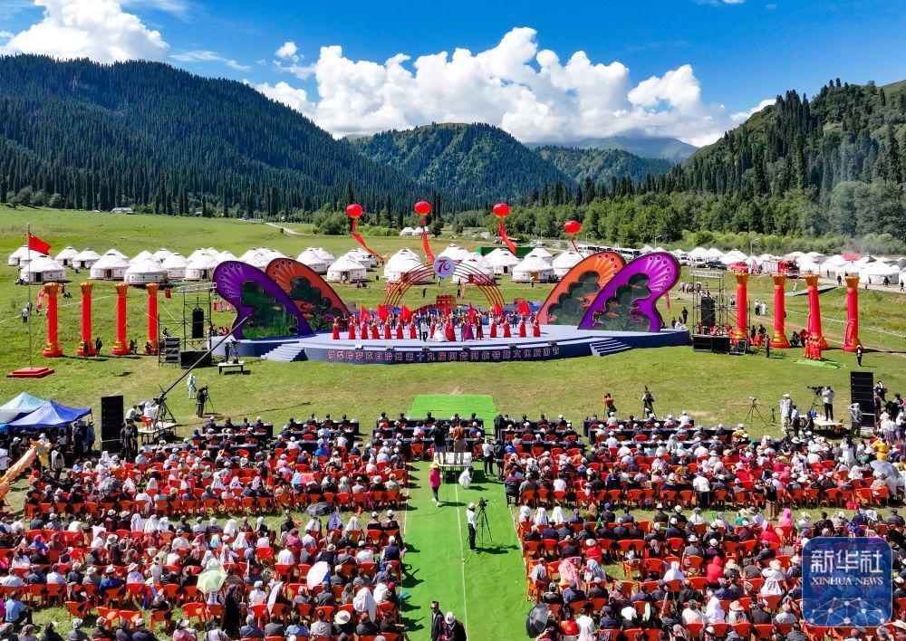 ↑这是7月19日拍摄的伊犁哈萨克自治州第十九届阿肯阿依特斯文化旅游节开幕式现场(无人机照片)。