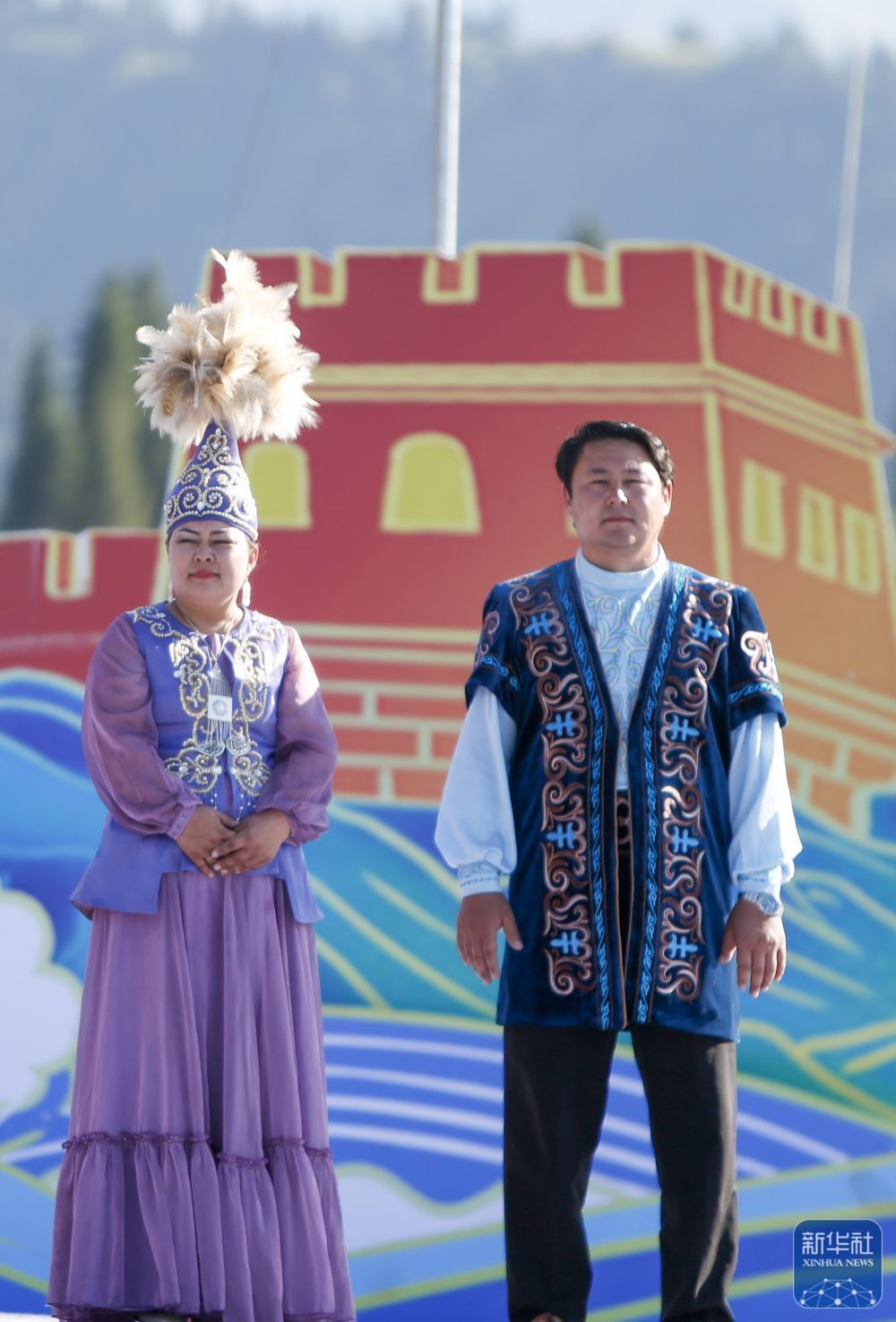 ↑7月20日,在伊犁哈萨克自治州第十九届阿肯阿依特斯文化旅游节闭幕式上,获得一等奖的阿肯阿依特斯组选手加米哈·达吾来提(左)和铁尔麦组选手吉额孜·吐肯上台领奖。