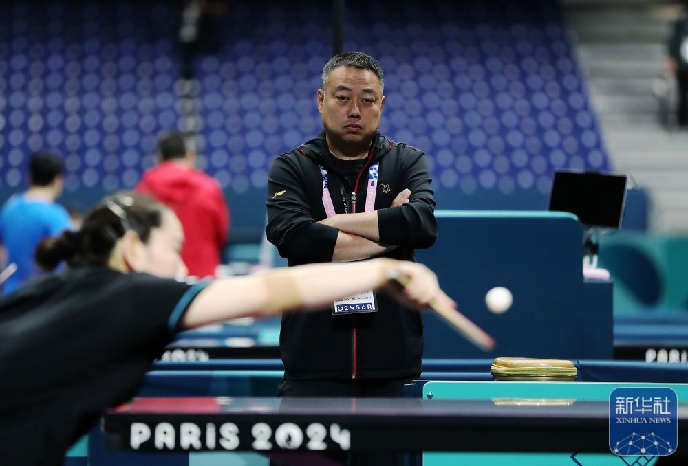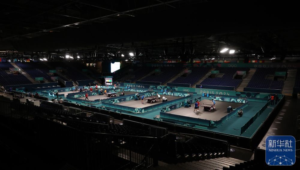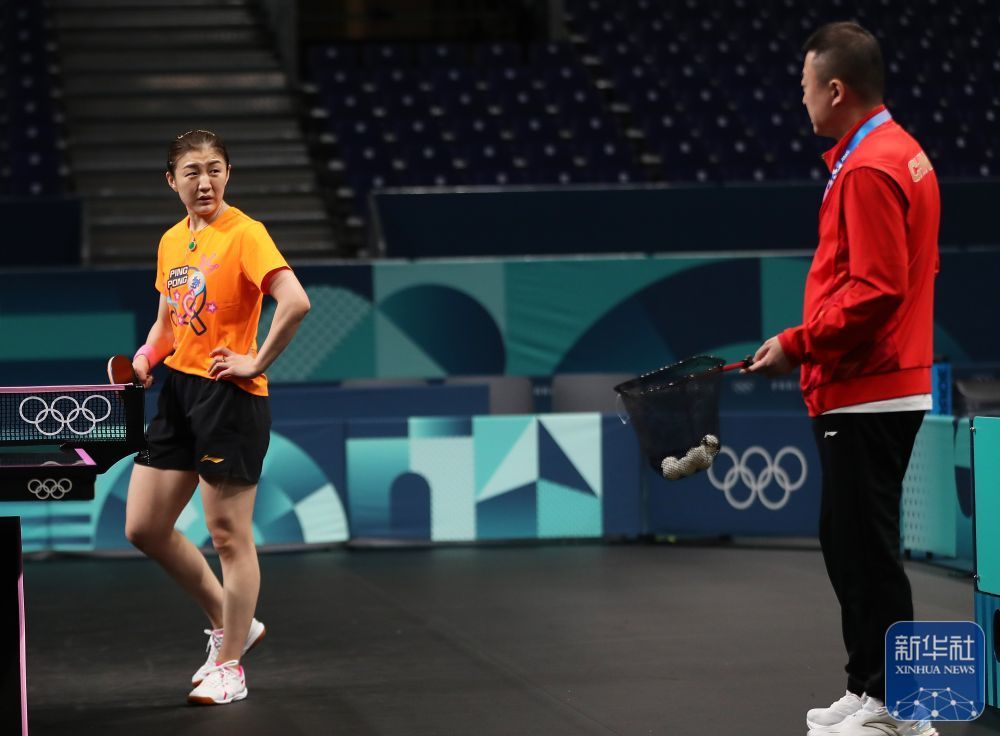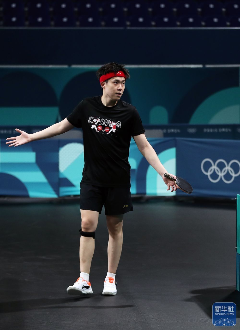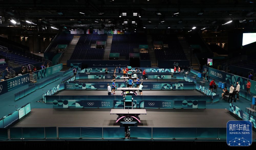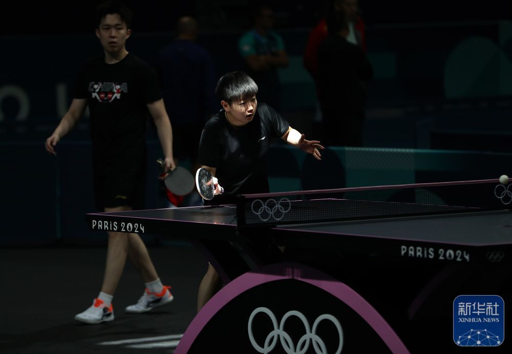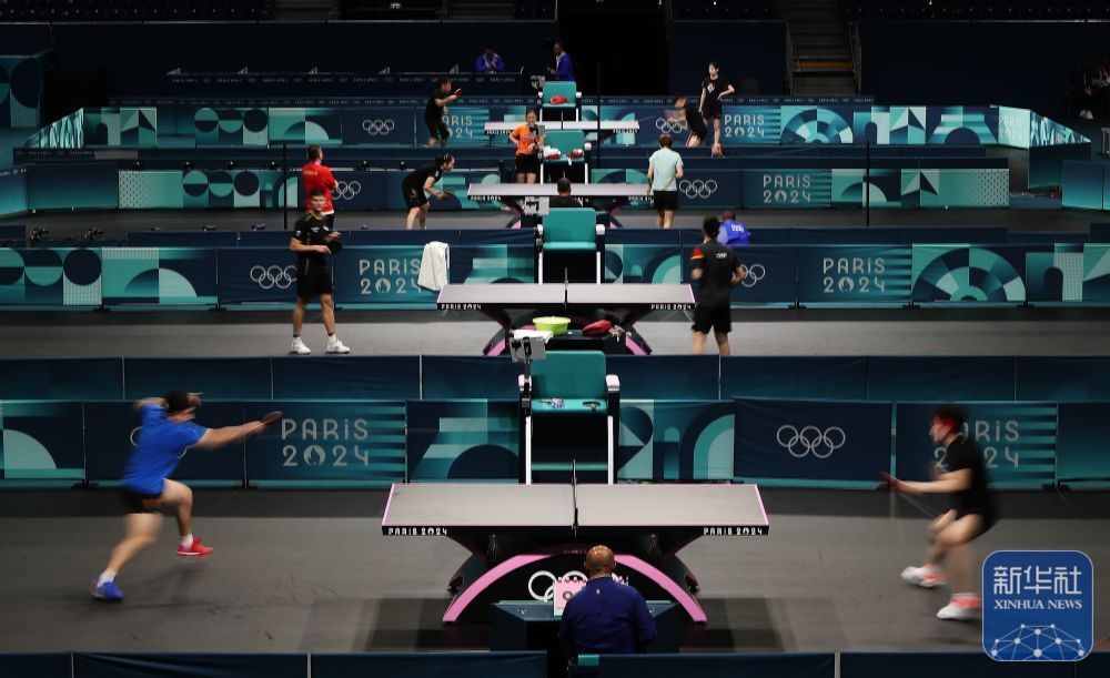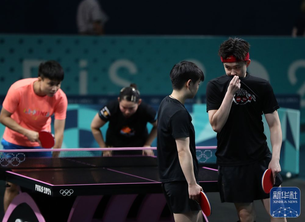 7月22日,中国国家乒乓球队在南巴黎竞技场进行赛前训练。巴黎奥运会乒乓球项目将于7月27日迎来首个比赛日。新华社记者 王东震 摄影报道