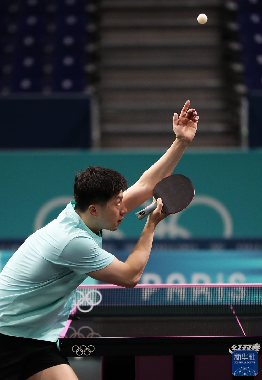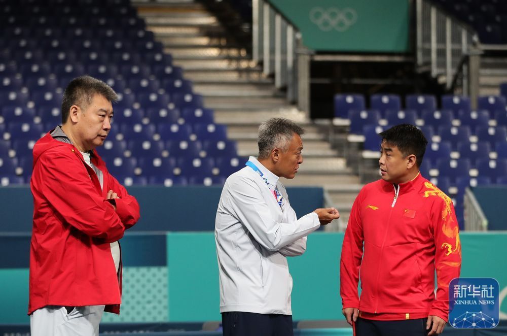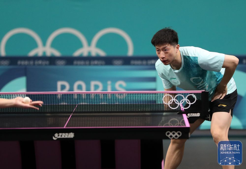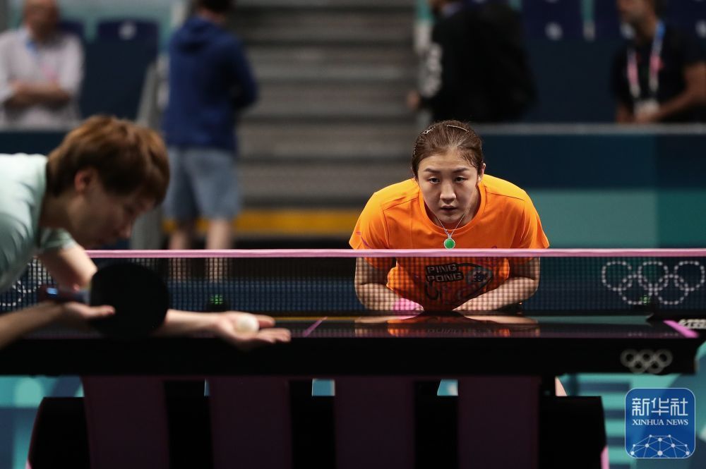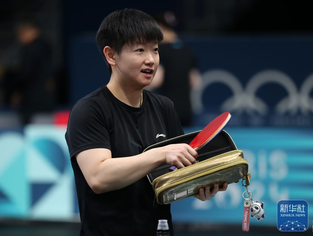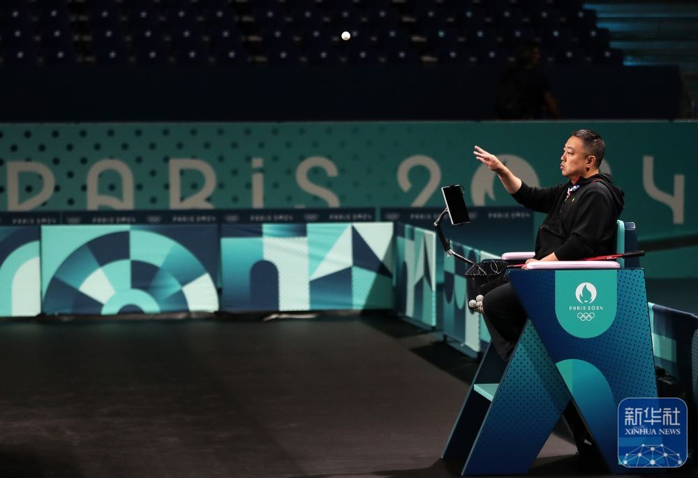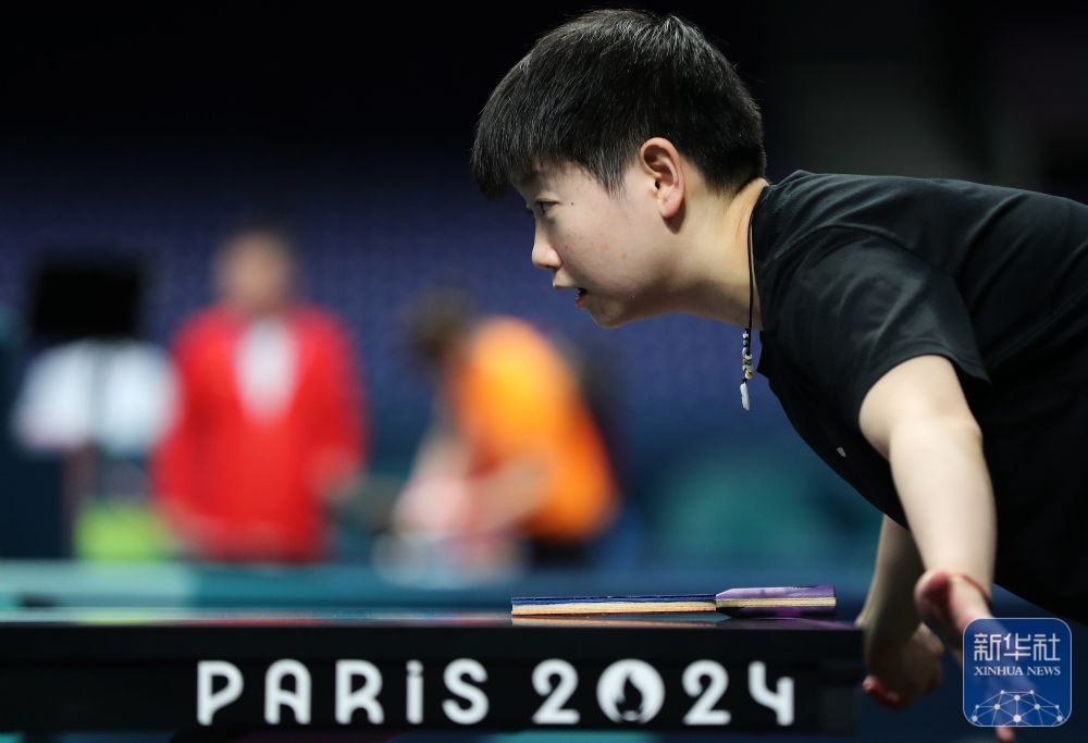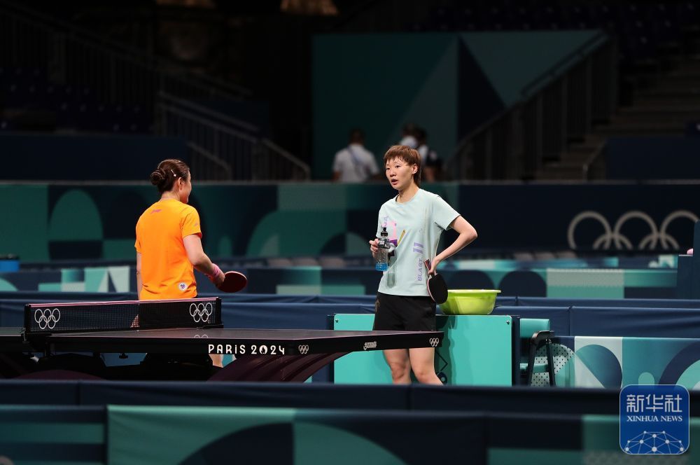 7月22日,中国国家乒乓球队在南巴黎竞技场进行赛前训练。巴黎奥运会乒乓球项目将于7月27日迎来首个比赛日。新华社记者 王东震 摄影报道