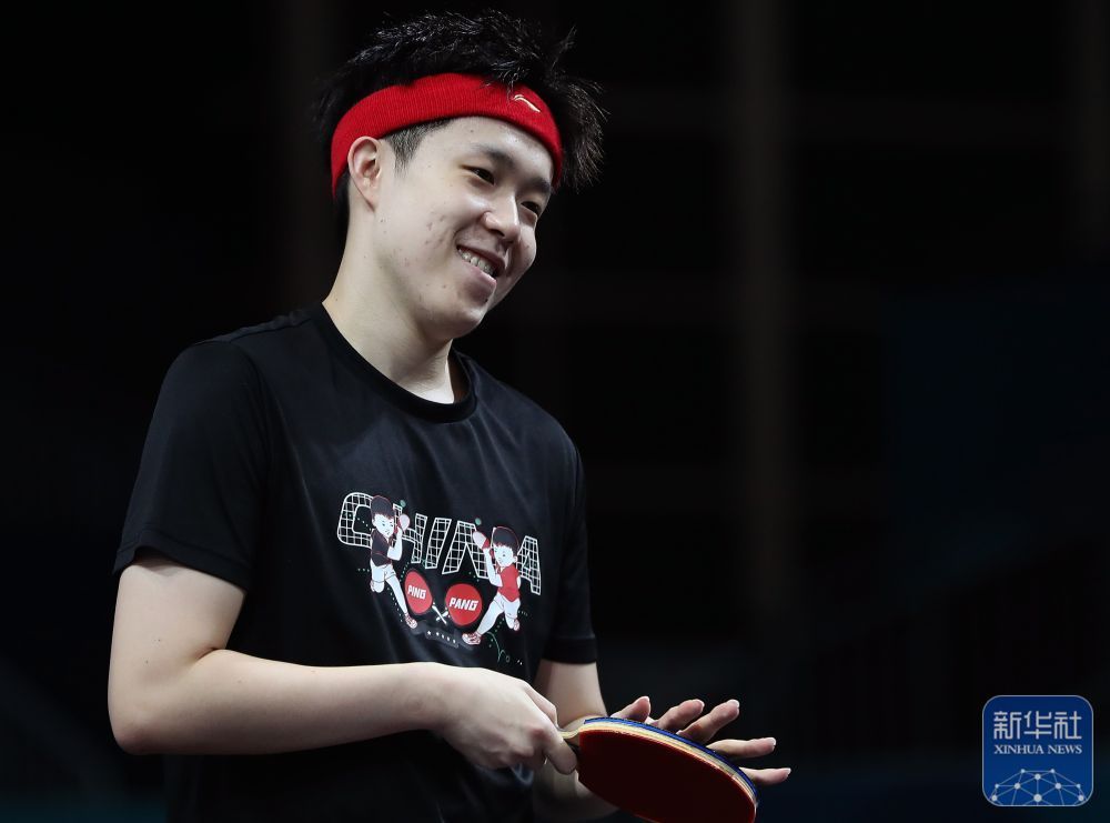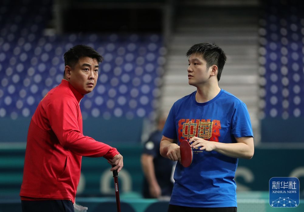 ↑樊振东(右)和教练王皓在训练间隙交流。