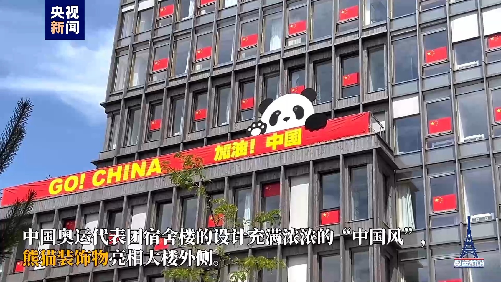 巴黎奥运村占地约52公顷,位于小巴黎北部近郊,共建成了82栋建筑,约3000套公寓。奥运会期间,这里将接待超过14000名运动员及工作人员,残奥会期间将接待约9000人。中国奥运代表团宿舍楼的设计充满浓浓的“中国风”,熊猫装饰物亮相大楼外侧。此外,宿舍楼还张贴了五星红旗、中国结和“加油!中国”字样的横幅。