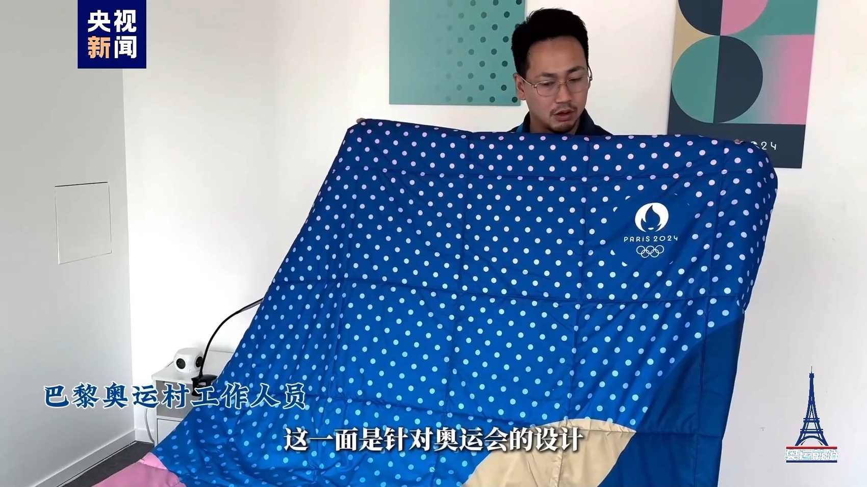 巴黎奥运村工作人员:运动员在结束比赛后,可以把这个被子留下当作纪念品。这一面是针对奥运会的设计,另一面是针对残奥会的设计。
