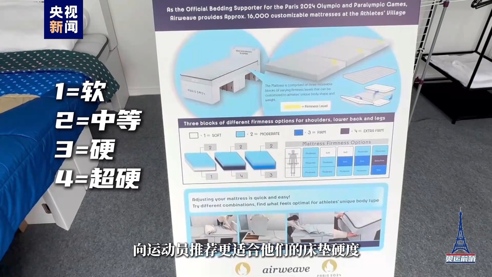 巴黎奥运村工作人员:我们通过系统分析运动员的身体情况,向运动员推荐更适合他们的床垫硬度。运动员就可以根据了解的情况,自己改变床垫的不同硬度。我们的床垫还是可水洗的。