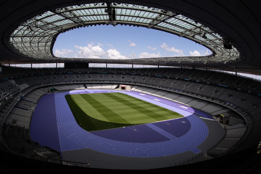 法兰西体育场铺设深浅两种紫色的跑道用于奥运会田径项目比赛。新华社记者 徐子鉴 摄