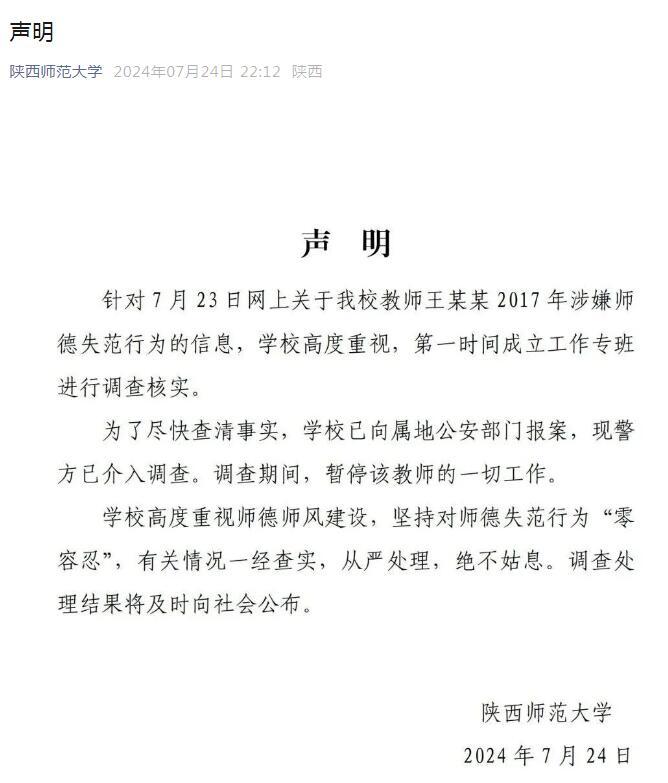 7月24日晚,陕西师范大学发布声明,全文如下: