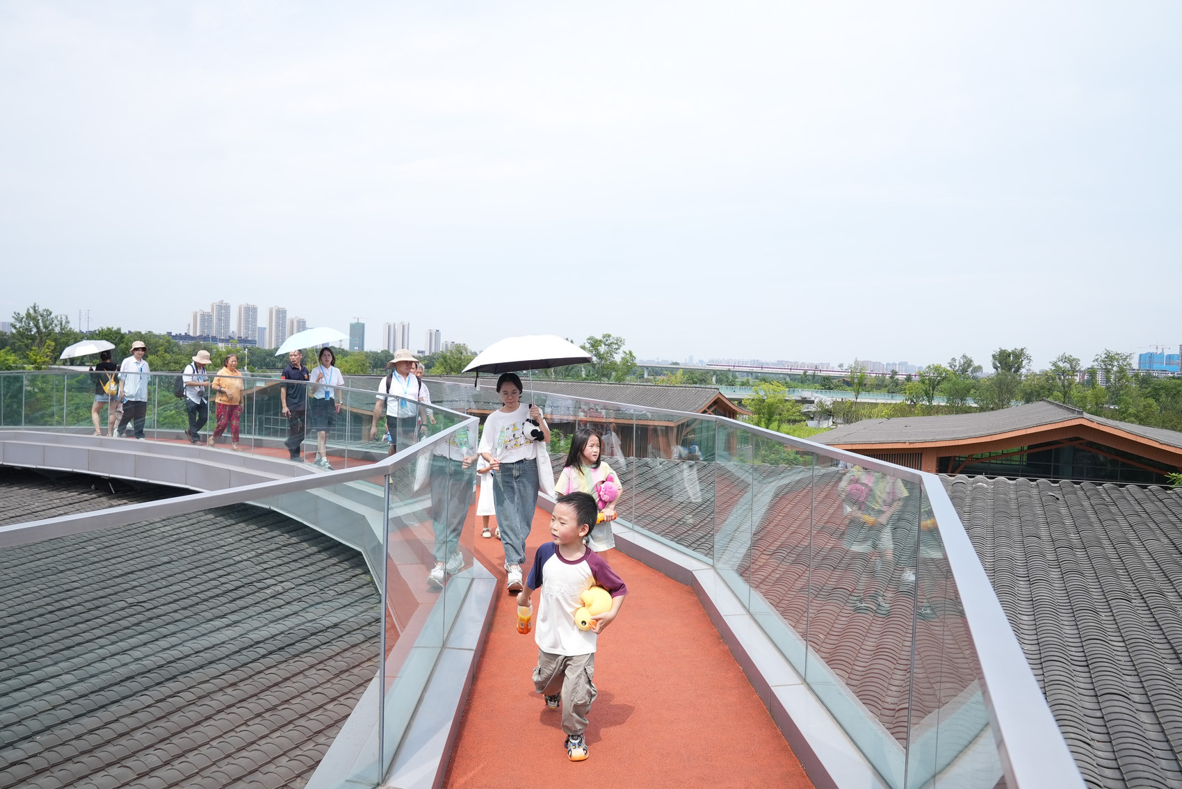 24日下午,蜀道通衢的“金牛古道”模拟场景,引发了媒体记者的好奇——在走过古意十足的蜀道后,顺着一段缓坡就连上了成都一级绿道——天府绿道,在空中接入了总长1.69万公里的绿道网络。更令记者们兴致盎然的,是在网红建筑“起风的院子”的屋顶上体验蜿蜒曲折的绿道。