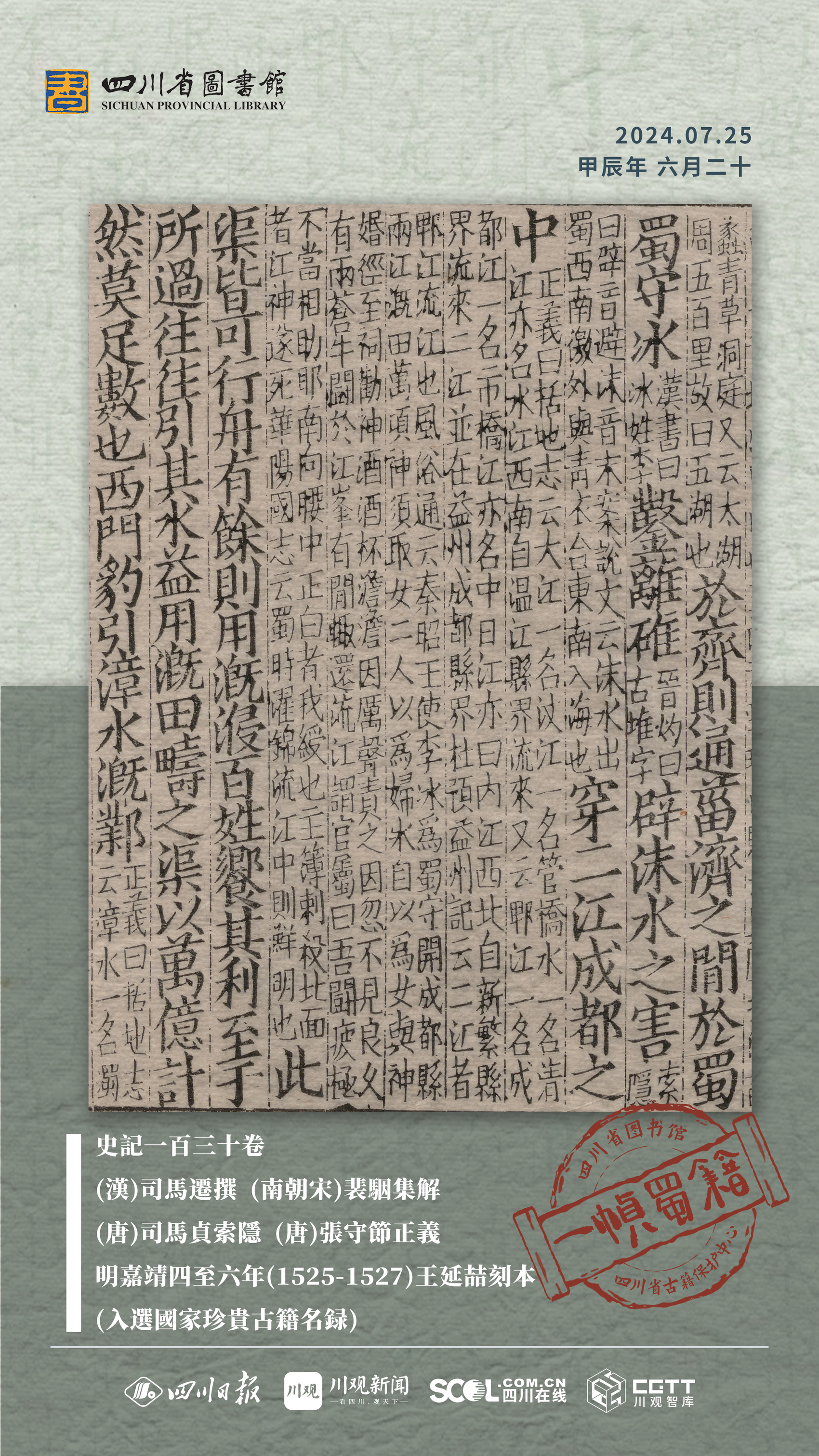 7月25日,一帧蜀籍带你走进都江堰。海报所选用图为《史记一百三十卷》(汉)司马迁撰(南朝宋)裴驱集解(唐)司马貞索隐(唐)张守节正义 明嘉靖四至六年(1525-1527)王延喆刻本(入选国家珍贵古籍名录)。