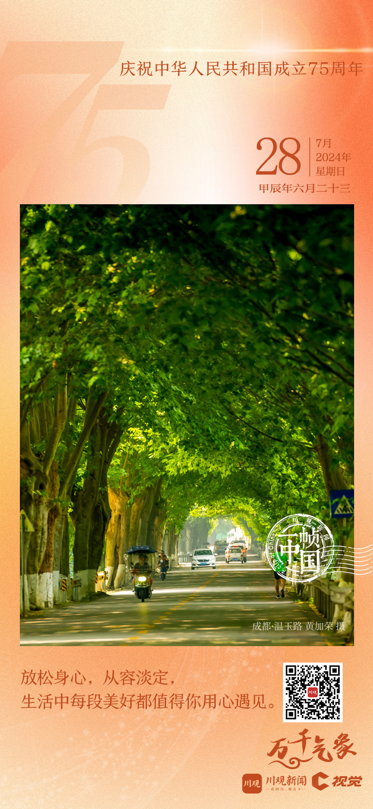 今天距离2024年国庆节还有65天。在这炎炎夏日,川观新闻《一帧中国》与你在成都“最美梧桐大道”——温玉路来一次City Walk。