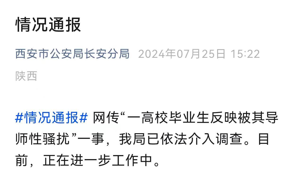 7月25日,西安市公安局长安分局发布情况通报称,网传“一高校毕业生反映被其导师性骚扰”一事,我局已依法介入调查。目前,正在进一步工作中。