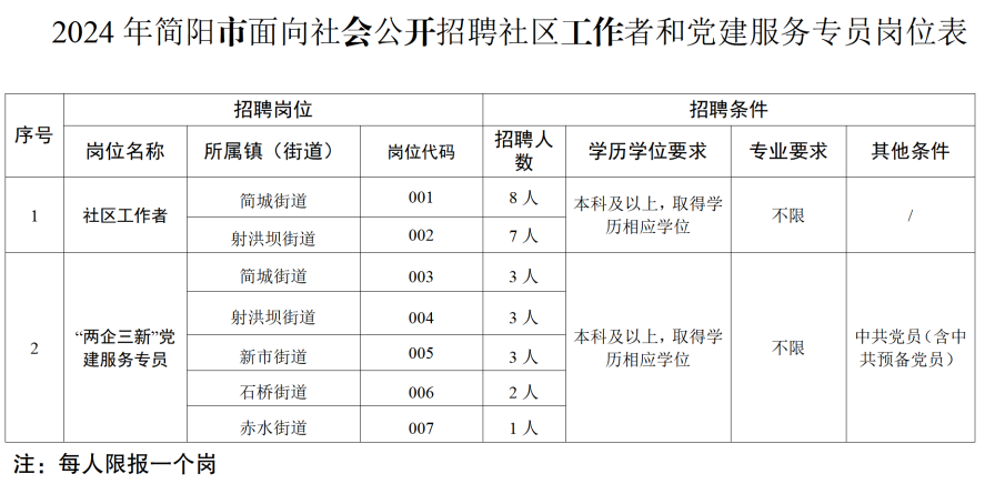 简阳市现面向社会公开招聘社区工作者15名,党建服务专员12名,本次招聘为编制外招聘。现将有关事宜公告如下: