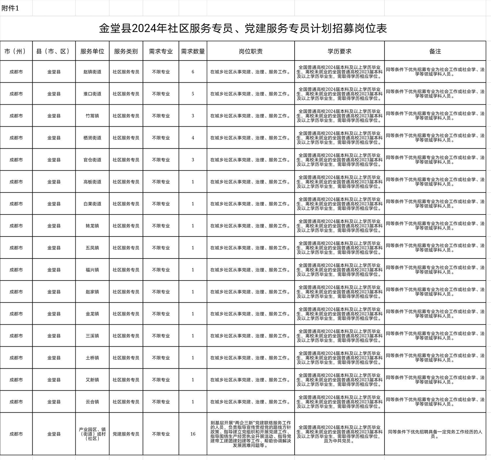 《2024年金堂县公开招聘社区服务专员、党建服务专员岗位表》