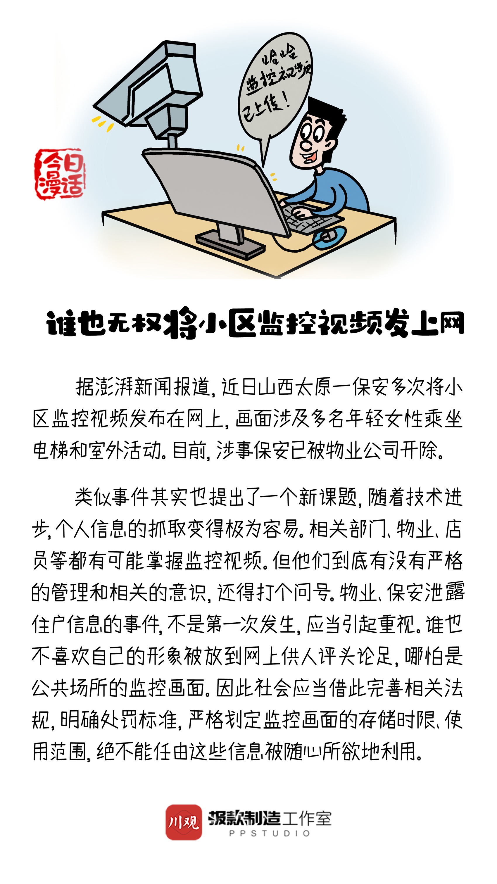 近日山西太原一保安多次将小区监控视频发布在网上,画面涉及多名年轻女性乘坐电梯和室外活动。目前,涉事保安已被开除。小区监控视频被发上网,你怎么看?