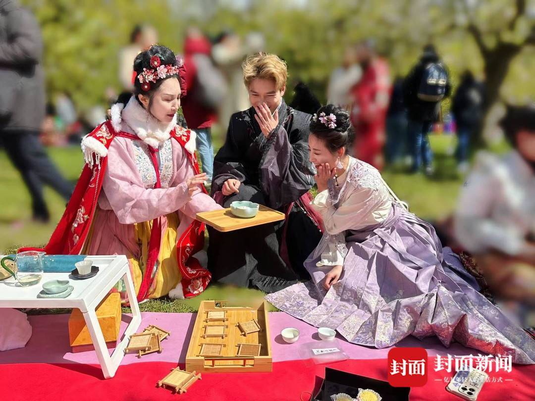 半日的春日集会,仲月茹和同袍们为前来体验的法国人准备了祓禊礼、流樱茶宴、品花朵佳果,簪花酒令、击鼓传花、投壶竞技等传统中国文化活动,给当地人留下深刻印象。“法国会员对汉服、汉文化是发自内心的纯粹的热爱,他们往往会选择更古朴、经典的汉服穿着,不像我们出街会选一些更便利、方便的,比如窄袖口、改良样式的。”