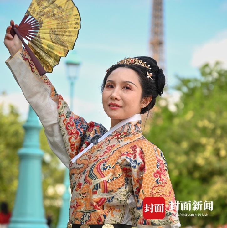 比尔哈克姆桥畔的一个河边公园,绿树在阳光下恣意生长,从这里望去,可以看到埃菲尔铁塔的全貌。公园里,一位中国人穿着帅气的飞鱼服,拿着一把折扇,吸引了不少法国人、外国游客的目光。川妹子,仲月如让法国人学会了汉服这个词,他在法国推广汉服16年,将汉服的精髓融入到法国的生活之中,将汉服的精神也融入到法国的这个国度浪漫之都,是值得点赞学习的。此次巴黎奥运会将汉服与奥运会精神融合交相辉映,必将擦出浪漫的火花!