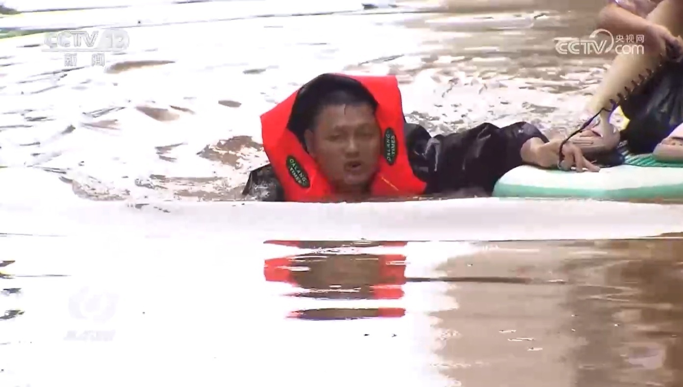 这是本月初发生在湖南岳阳平江县的一幕。在水中拉着桨板转移群众的人叫余祖恩,能看出来水很深,水中的余祖恩只露出来半个头,为了尽可能保持桨板稳定,他拉拽着桨板,小心翼翼地游泳前行。