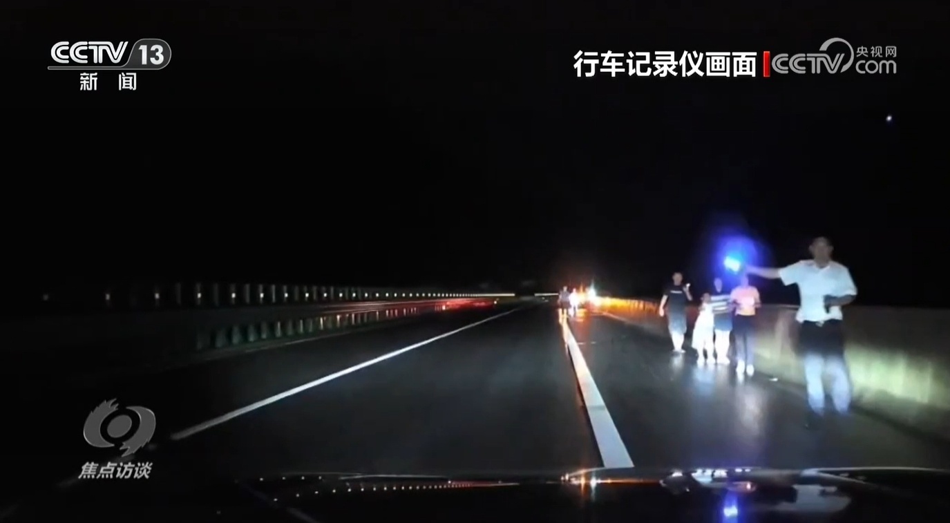 千钧一发的危急时刻,曾经当过兵的夏辉和妻子拿着车上的强光手电筒往回跑,开始拦停后方来车。