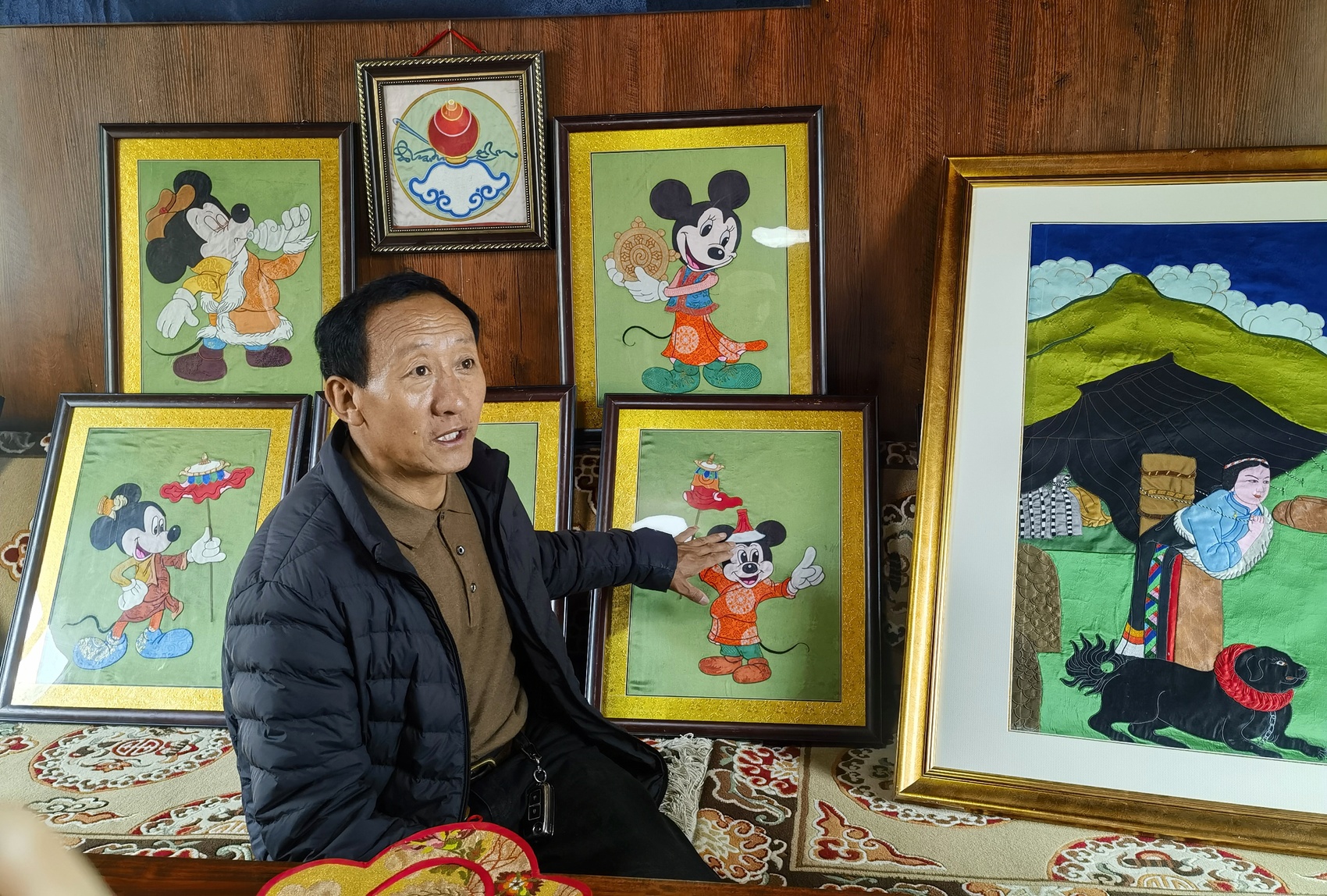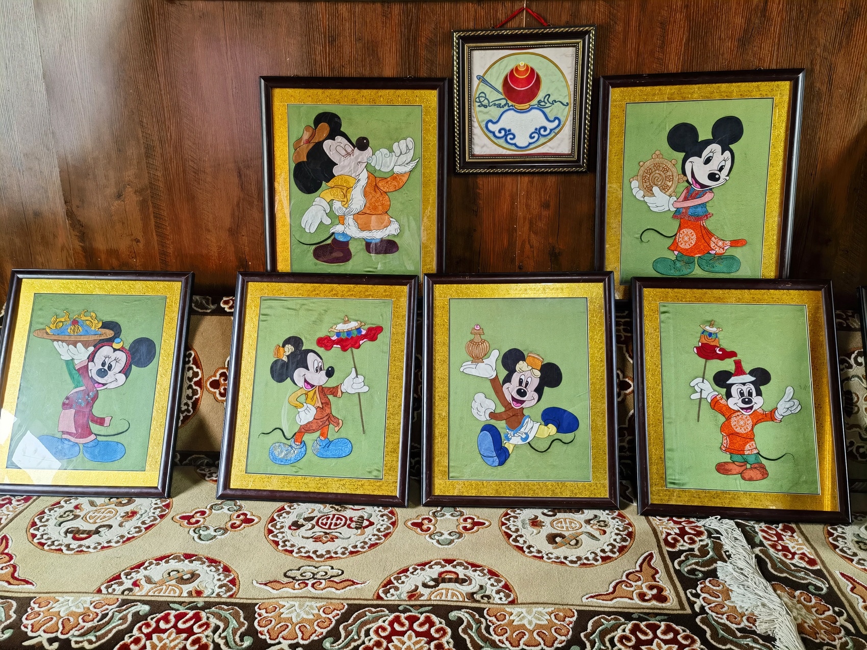 针线穿梭的岁月看似一成不变,但许多改变正逐渐发生。2021年,拉萨堆绣唐卡入选第五批国家级非物质文化遗产代表性项目名录。在传承中心的作品展览室里,记者看到,一幅幅人物和花卉鸟兽鲜活地呈现在眼前。在角落里有几张大家非常熟悉的经典卡通形象——“米奇”堆绣装饰画,让“米奇”身穿西藏七市地的特色民族服装,手拿吉祥八宝,这种跨界融合是堆绣唐卡内容不局限于往常题材的探索和尝试。罗布说,之所以选用被大家所熟知的卡通形象来进行创新,也是希望拉萨堆绣能够被更多年轻人了解和喜爱。罗布认为,制作技艺可以根据时代的发展作出创新和变化,只有这样才能更好地将这门技艺传承下去。