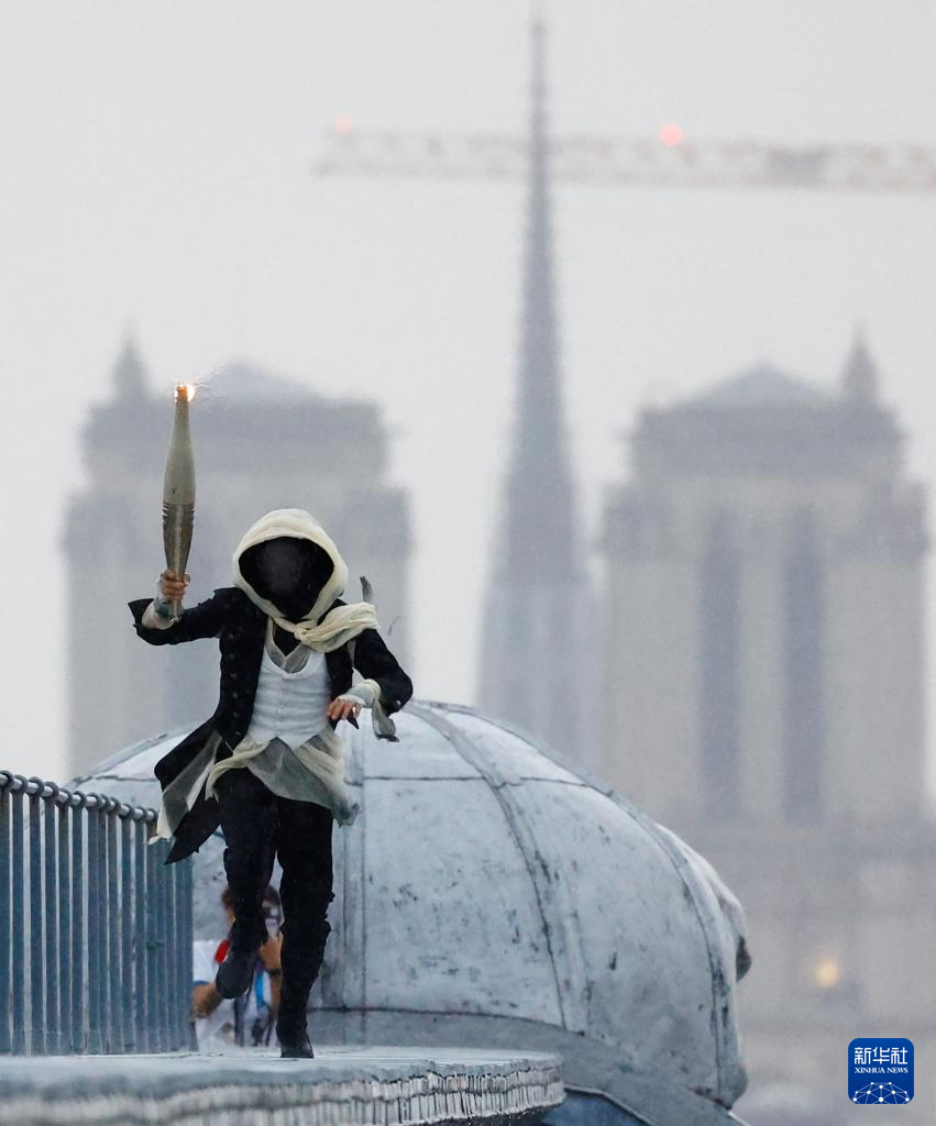 沿行进路线奔跑的火炬手,冒雨穿梭在沿岸建筑中。目睹巴黎圣母院脚手架上工人的舞蹈表演、走进工坊参观奥运奖牌铸造、从卢浮宫的杰作前路过......场景转换间,人们仿佛从文明的长河中顺流而下。