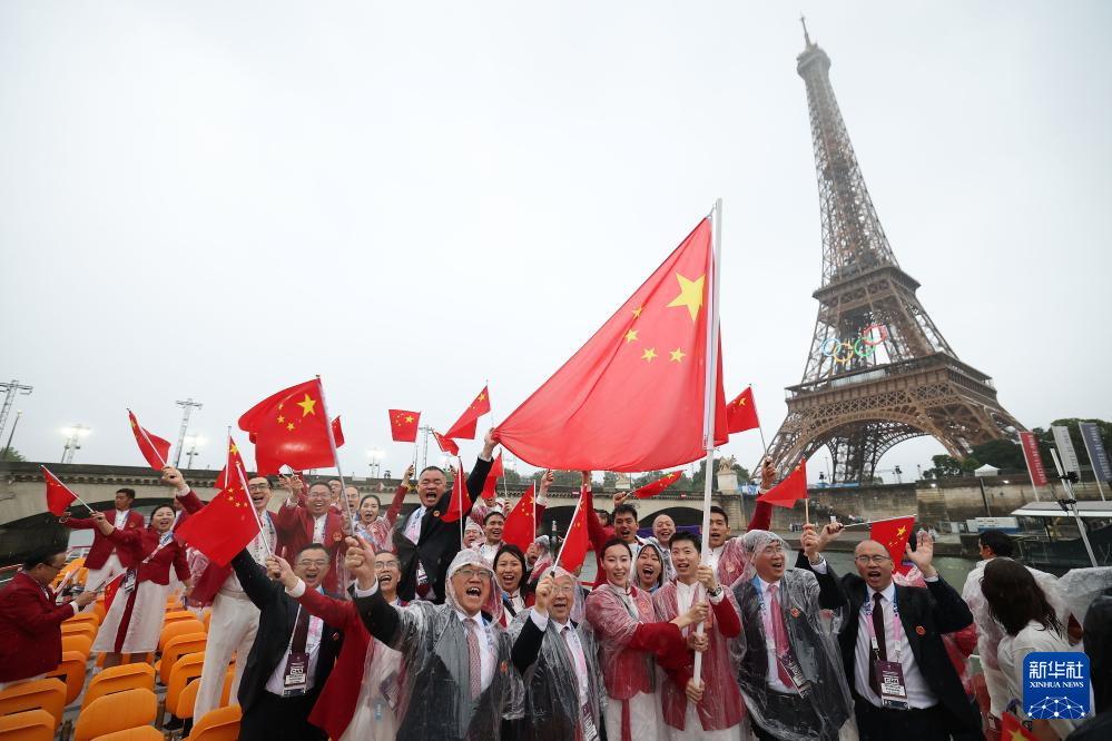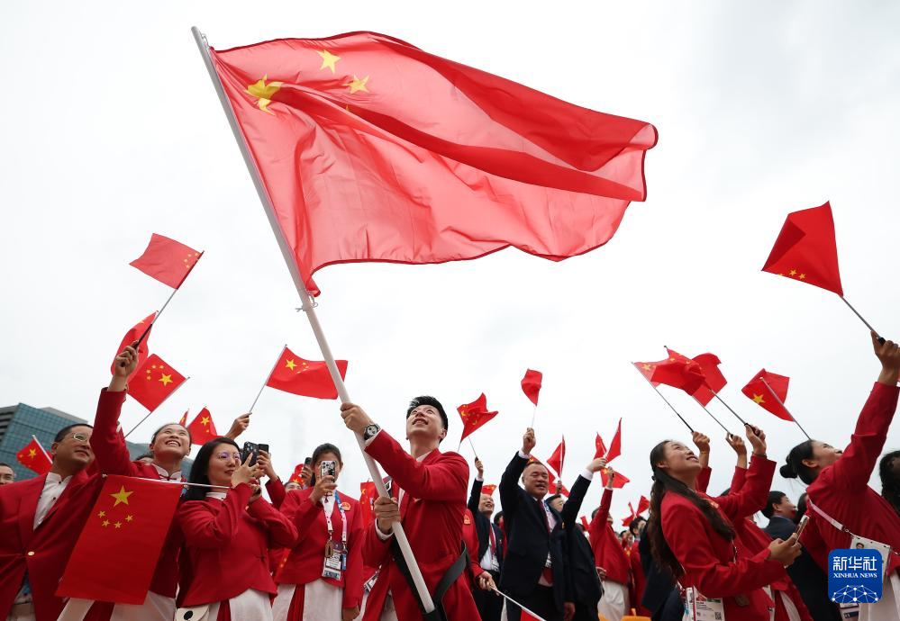 7月26日,中国体育代表团成员在开幕式上。新华社记者 曹灿 摄