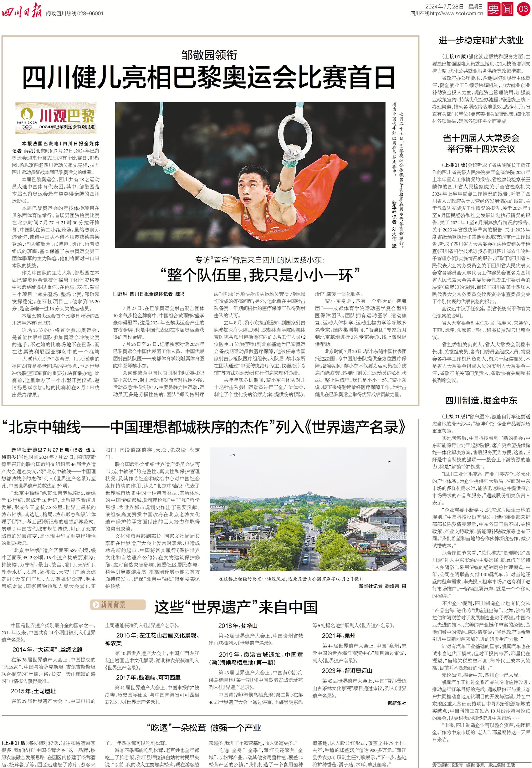 昨日,黄雨婷、盛李豪为我国获得首金。其背后来自四川的队医黎小东也发挥了自己独特的作用。他和他的智囊团将针灸、拔罐等中医理疗手法器材,从成都带到了巴黎,用“郑氏伤科疗法”持续保障运动员身心健康。此外,在28名来自四川的运动员中,参加了跳马、双杠、鞍马三个项目的邹敬园和首位代表我国参加奥运会冲浪比赛的杨思琪已经亮相。关注今日1版和3版,一起为四川健儿加油。