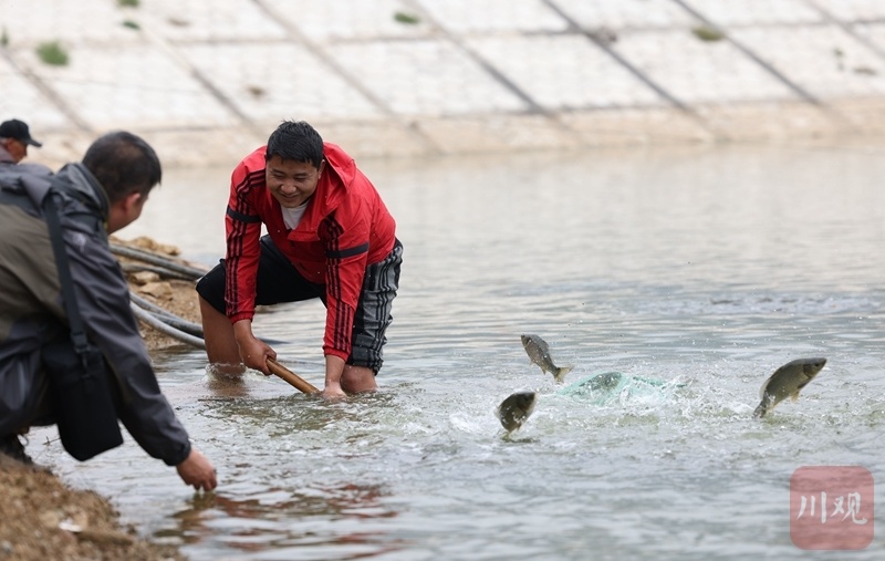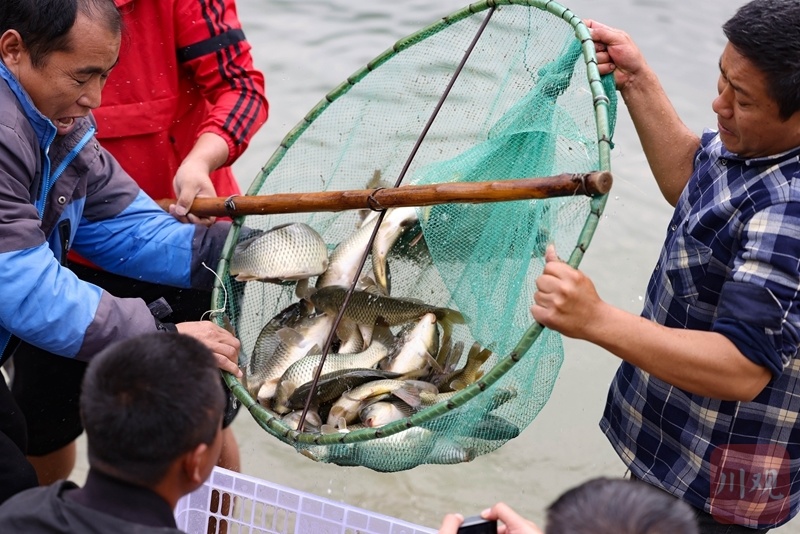 一网兜下去,十四五条鱼跃出水面钻进鱼网,村民金曲则双臂用力划了一道弧线,把网兜捕到的鱼装进水桶,“小的有斤把重,大的有两斤多,丰收喽。”