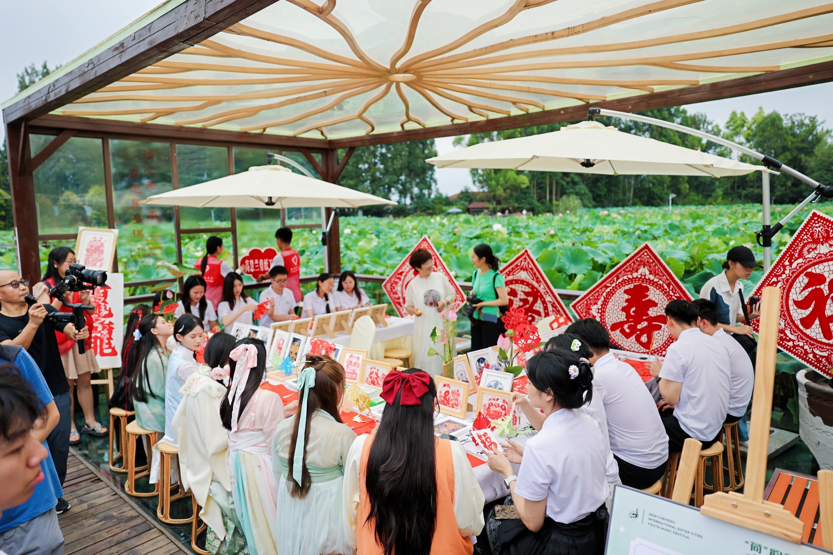 下午的国际交流是本次活动的一大亮点。国际友城青年在千亩荷塘景区参加了主办方精心准备的“美食体验、汉服体验、游船赏荷”三大活动,大家还开心地品尝了具有新津特色和深厚人文的“全荷宴”。