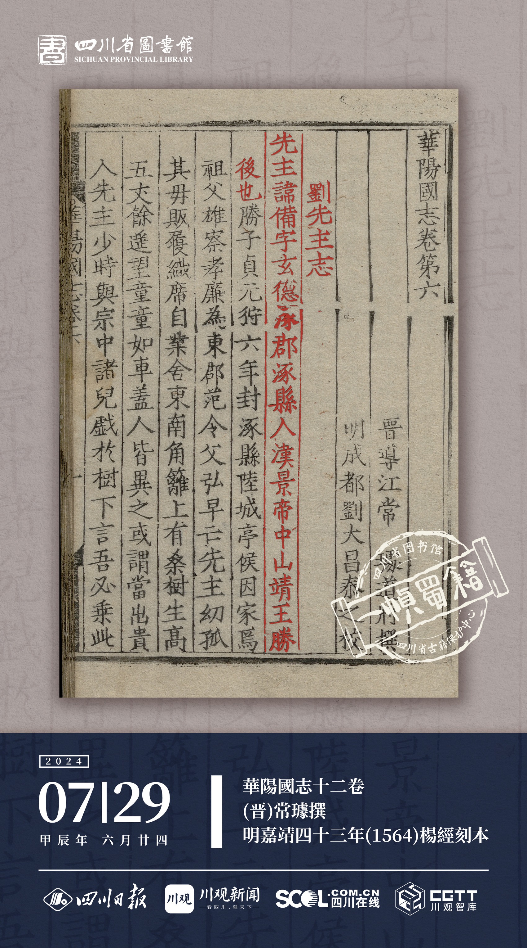 7月29日,一帧蜀籍带你走进史书《华阳国志》,了解三国时期蜀汉开国皇帝刘备,史家又称他为先主。海报图所选用的版本为《华阳国志》十二卷,(晋)常璩撰,明嘉靖四十三年(公元1564年)杨经刻本。