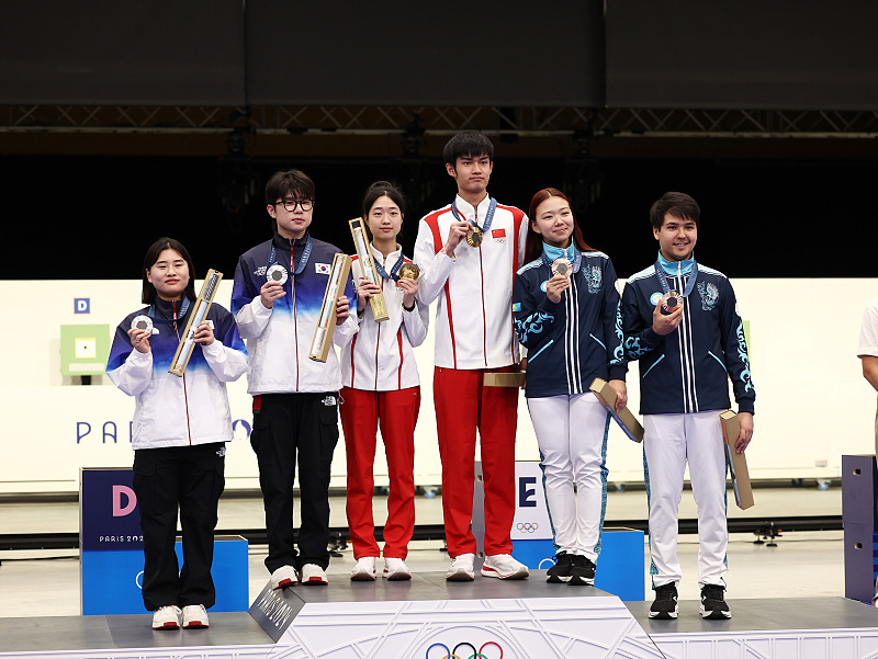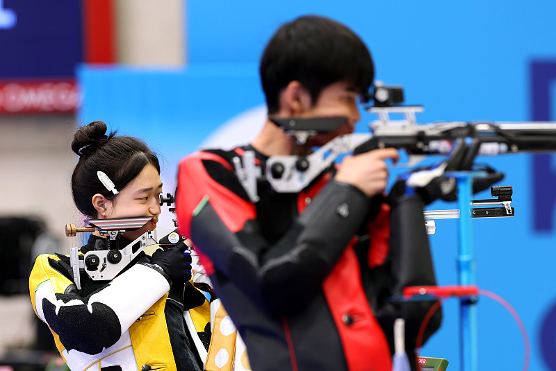 当地时间27日上午,巴黎奥运会射击10米气步枪混合团体比赛在沙托鲁射击中心举行,中国组合黄雨婷/盛李豪在金牌赛中以16比12战胜韩国选手金智贤/朴是晙,获得本届奥运会首枚金牌,延续了中国射击队的“首金传统”。