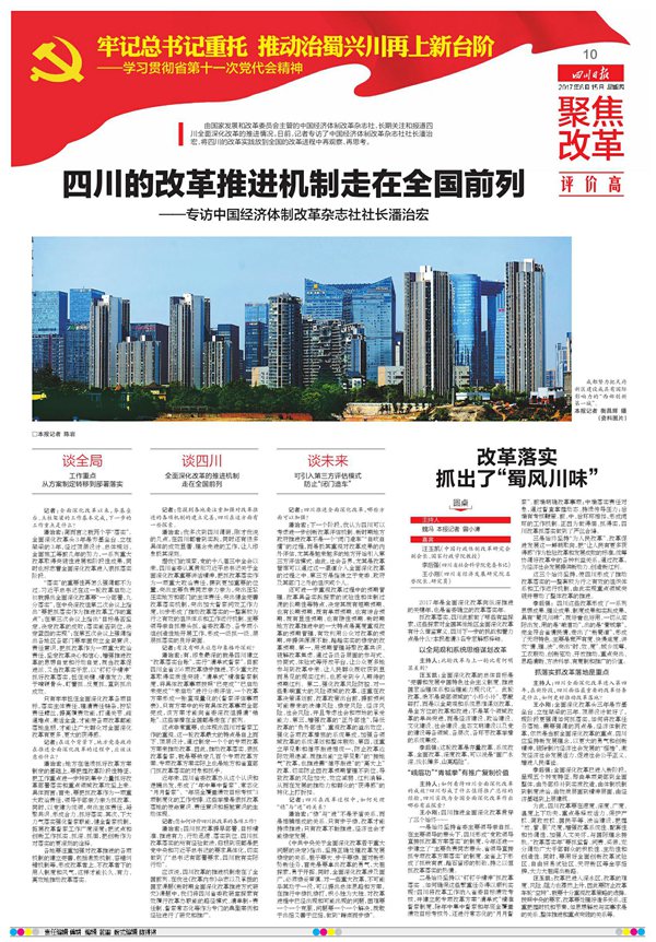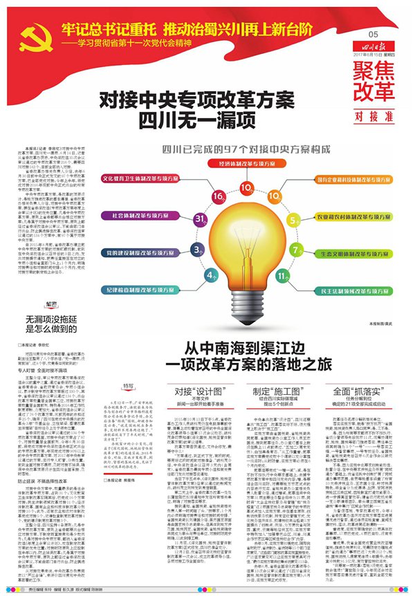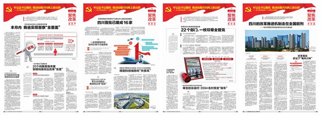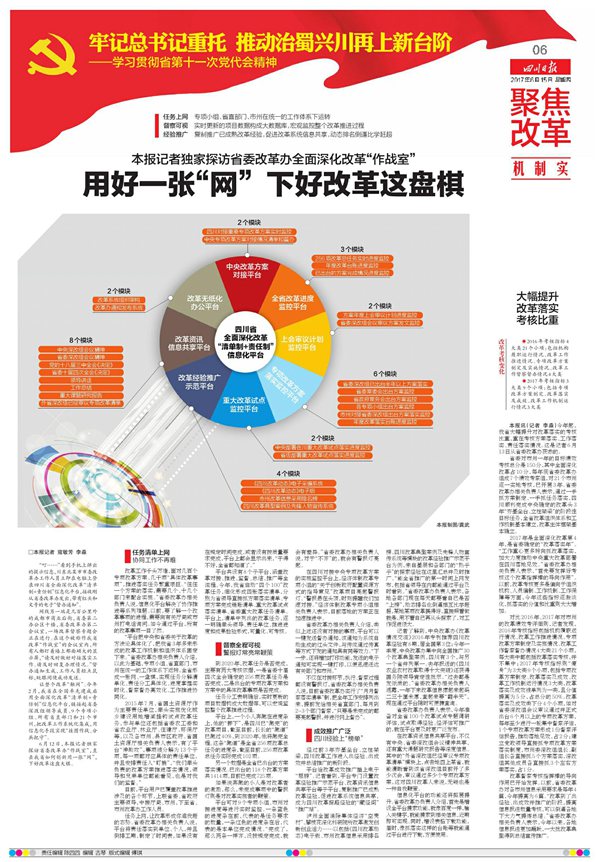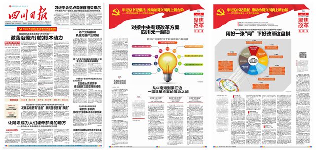 在四川日报的第五版至第十版,总计6个版面中,分别从6个方面:对接准、机制实、督察严、特色足、成效显、评价高,对四川的全面深化改革实践进行了充分报道,点面结合,有理有据,令人信服。