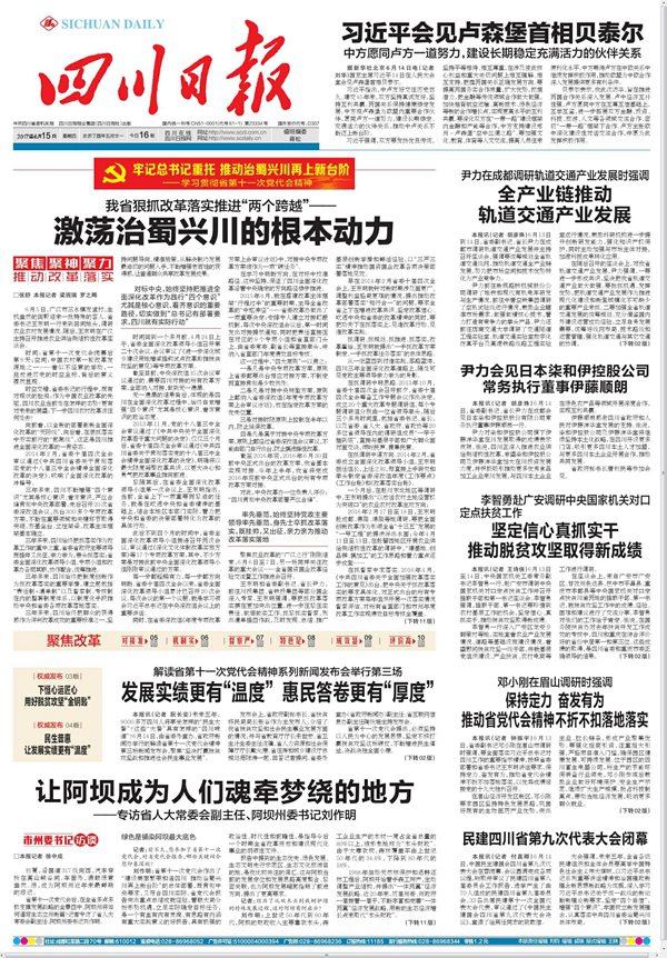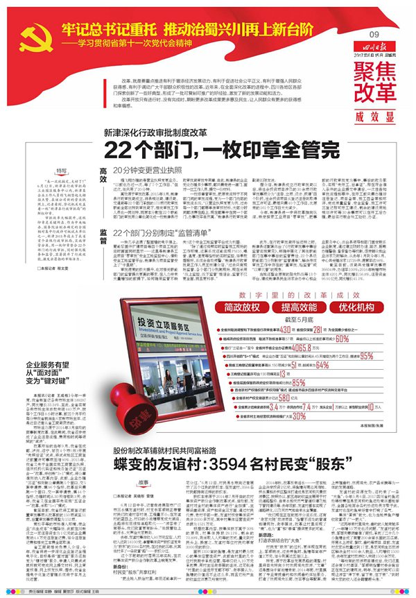 今天,6月15日,四川日报又出版了一期值得收藏细读的报纸,因为它用“头版头条+6个整版”的篇幅,对四川全面深化改革的成果、经验、评价作了一个全面梳理。全部文章结构谨严,观点鲜明,事实丰富,具有很强的理论性、新闻性、史料性,读后可以深入了解四川的已有成就,也可以看到四川今后的发展路径,对于每一位热爱四川、关心四川发展的干部群众来说,是很有价值的。