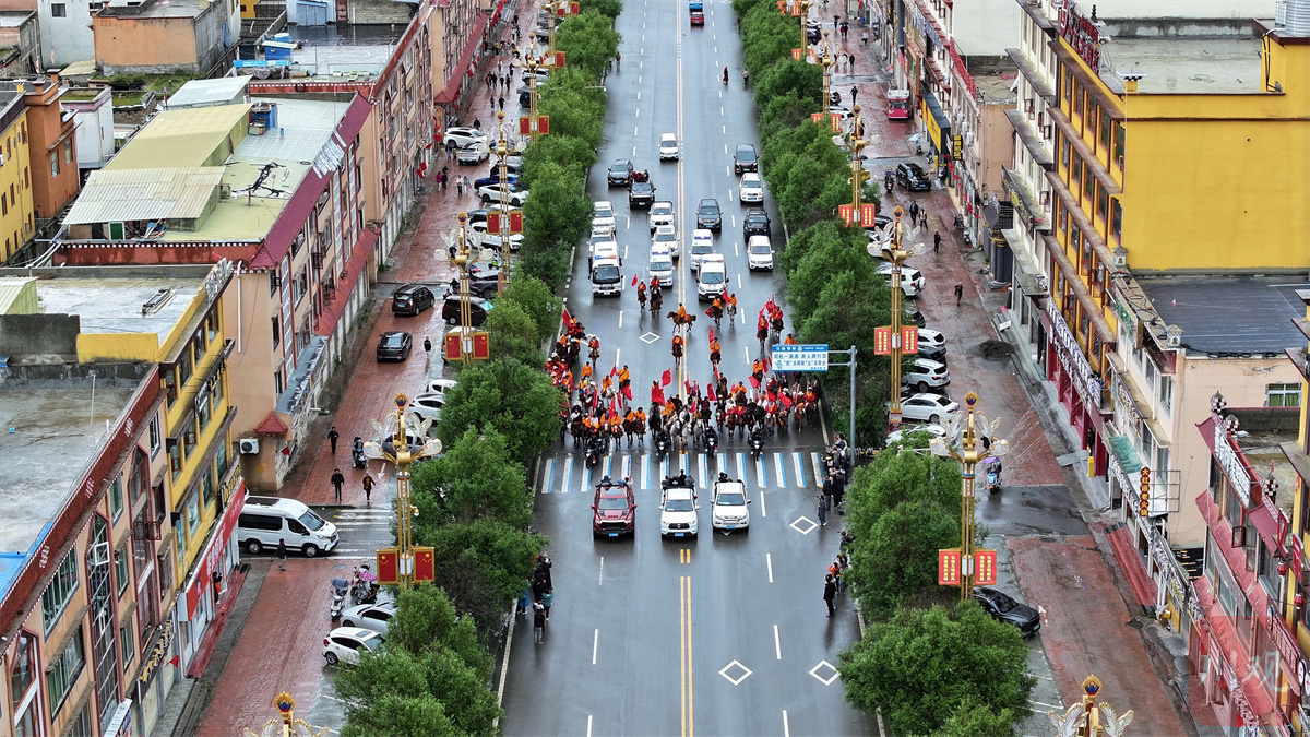 现场,丁真身着传统的藏族服饰,骑着装饰华丽的骏马,在队伍的最前方引领着巡游,康巴汉子们紧随其后,他们个个精神抖擞,身姿矫健,手中挥舞着五星红旗,展现出藏族儿女的豪情壮志。