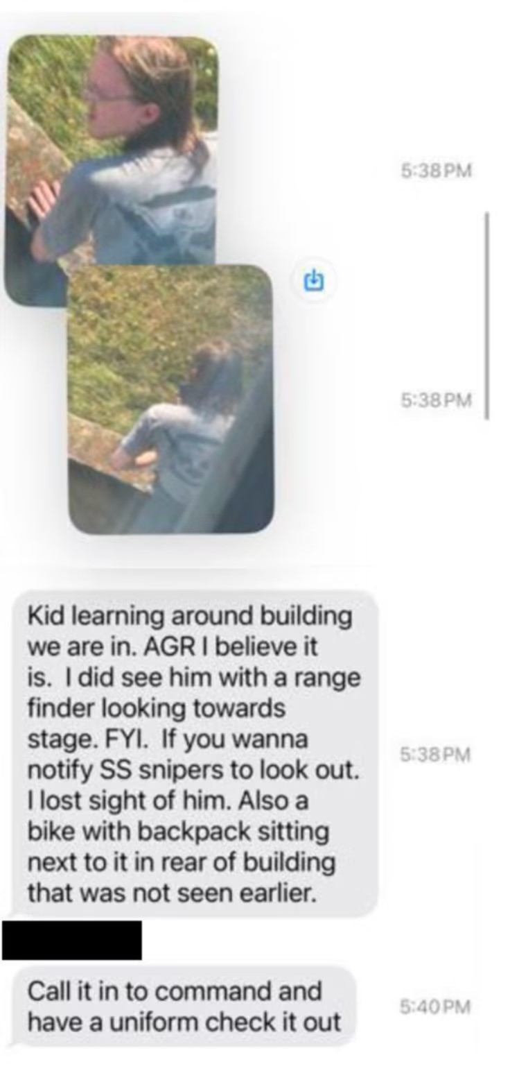 报道称,根据执法行动报告,下午5时10分,这名男子出现在反狙击手的正下方,其中一名反狙击手对他进行了拍照。下午5时38分,这些照片在群聊中被分享。“这孩子在我们所在的建筑周围观察。我确实看到他拿着测距仪朝舞台看。如果你想通知特勤局狙击手注意的话,供参考。我看不到他了。”