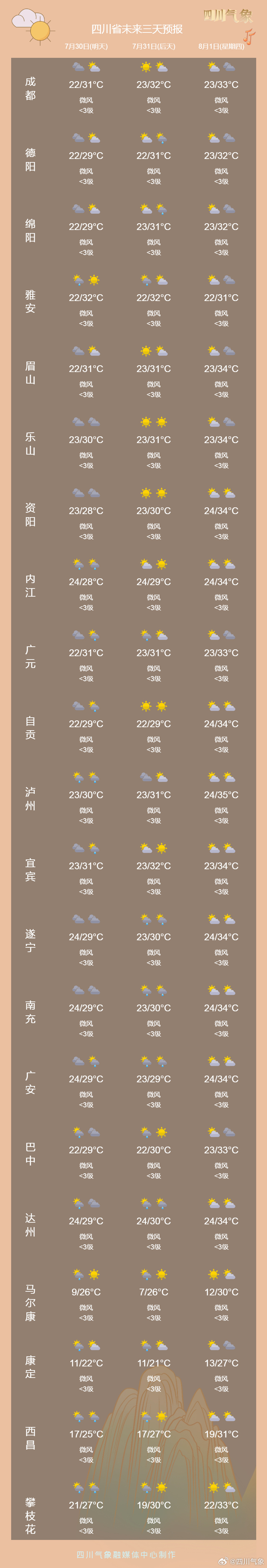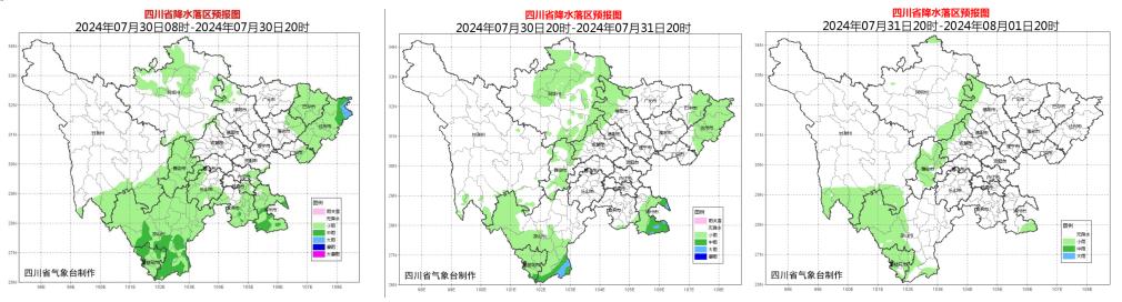 至于川西高原和攀西地区,在未来一段时间都是多阵雨或雷雨的天气,局部有中到大雨,其中30日局地有暴雨。四川省气象台提醒,这片区域要注意防范滑坡、泥石流、山洪等地质灾害的发生。未来三天天气怎么样?一图了解↓