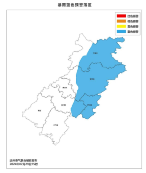 29日15时03分,达州市气象台发布了今天之内的第二个暴雨蓝色预警:预计7月29日晚上到30日白天,达州市将出现一次强降水天气过程。万源、宣汉、开江、东部经开区、达川区东部有大到暴雨(40~80毫米),局地大暴雨(100毫米以上),最大小时雨强40~60毫米;其余地方中到大雨(20~40毫米),局地暴雨。过程中伴有短时强降水、雷电大风等强对流天气。请注意防范强降水可能引发的城镇内涝、山洪、地质灾害。