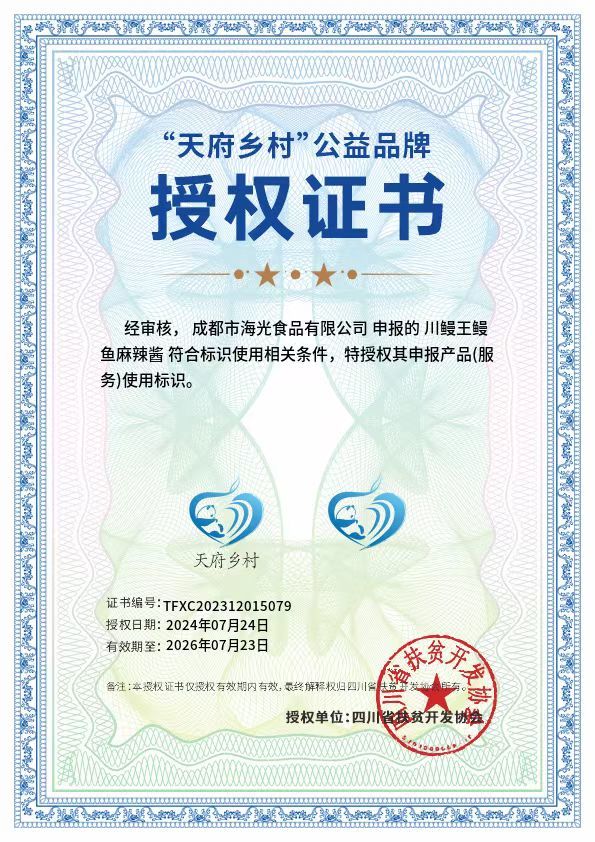 据悉,“天府乡村”公益品牌是“担当”和“品质”的代名词。四川省供销社相关负责人介绍,“天府乡村”公益品牌是为巩固拓展脱贫攻坚成果,全面推进乡村振兴,在原“四川扶贫”公益品牌基础上,更名升级的省级公益品牌,申报条件严格。得益于鳗鱼养殖在联农带农方面的积极效益,以及对产品品质的严苛要求,成都市海光食品有限公司(下称“海光食品”)旗下2款产品荣获“天府乡村”公益品牌授权证书。今后将被作为优质农产品推荐参加省内外展示展销活动,并优先参与各级消费帮扶定向采购活动。