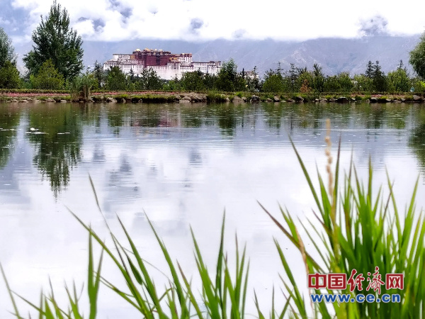 在“布宫镜湖”前远眺布达拉宫 中国经济网记者魏金金/摄