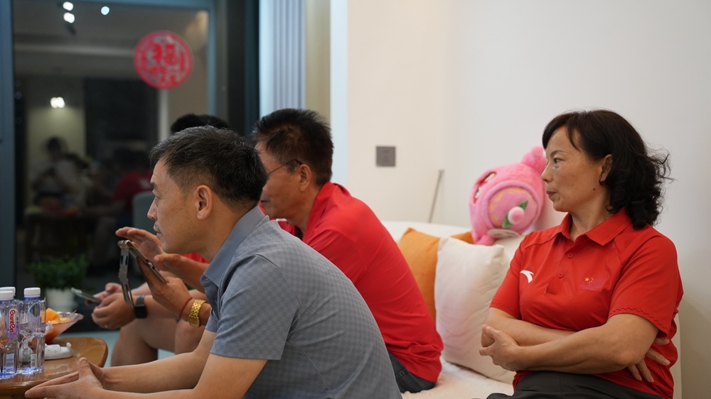 比赛开始前一个小时,邹敬园的妈妈刘丽群就已经打开电视,摆起水果,和邹敬园的爸爸、邹敬园的启蒙教练李小兵一起守候在电视机旁,准备观看比赛。客厅的茶几上摆放着邹敬园此前参加比赛的照片,刘丽群和李小兵特意换上了红色短袖。北京时间晚上11点30分,比赛正式打响,随着中国队出场,邹敬园家里的观赛气氛也点燃了。