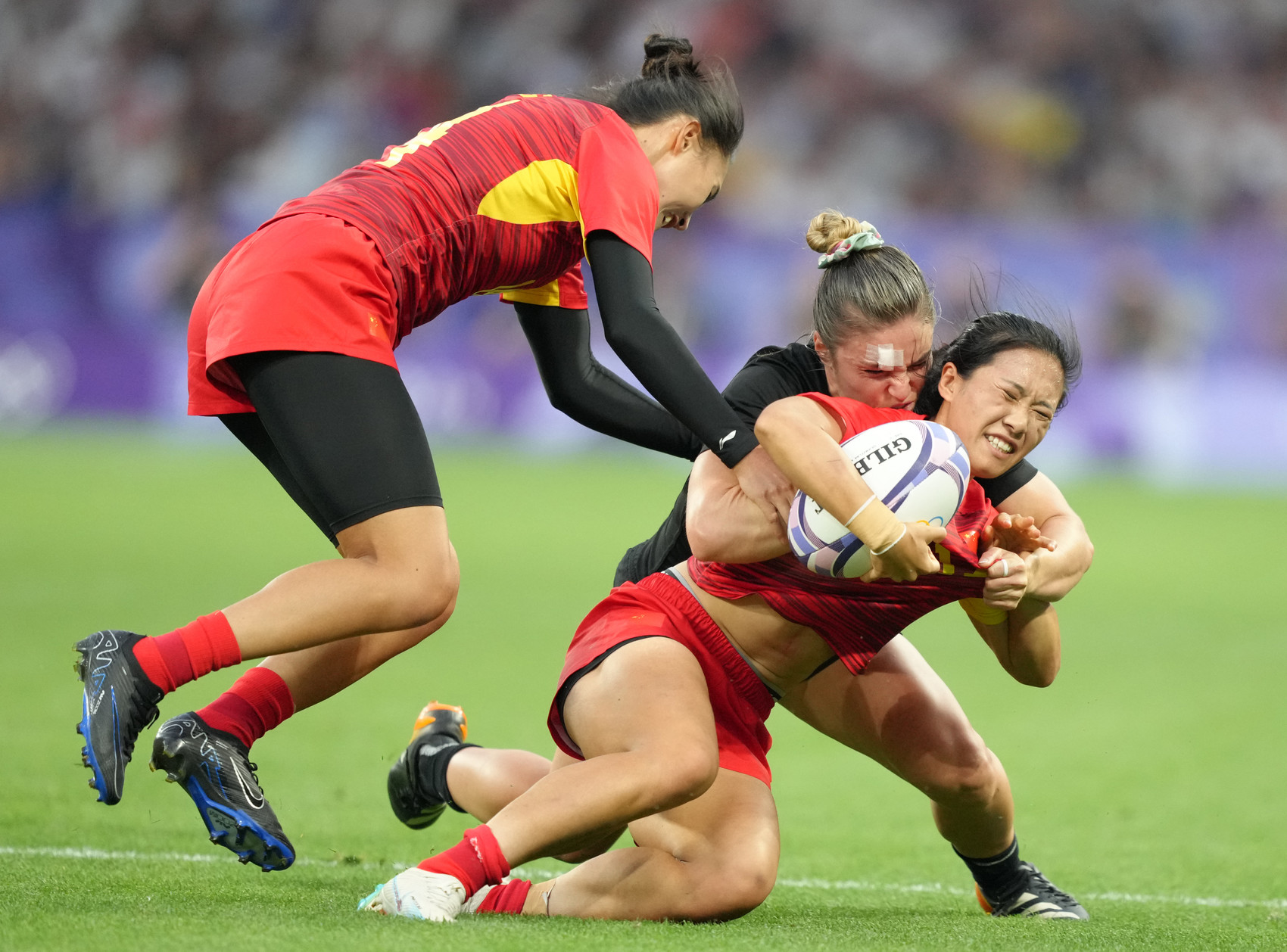 7月29日,中国队球员胡宇(前)在比赛中。 当日,在巴黎奥运会七人制橄榄球女子四分之一决赛中,中国队5比55不敌新西兰队。 新华社记者 吕小炜 摄