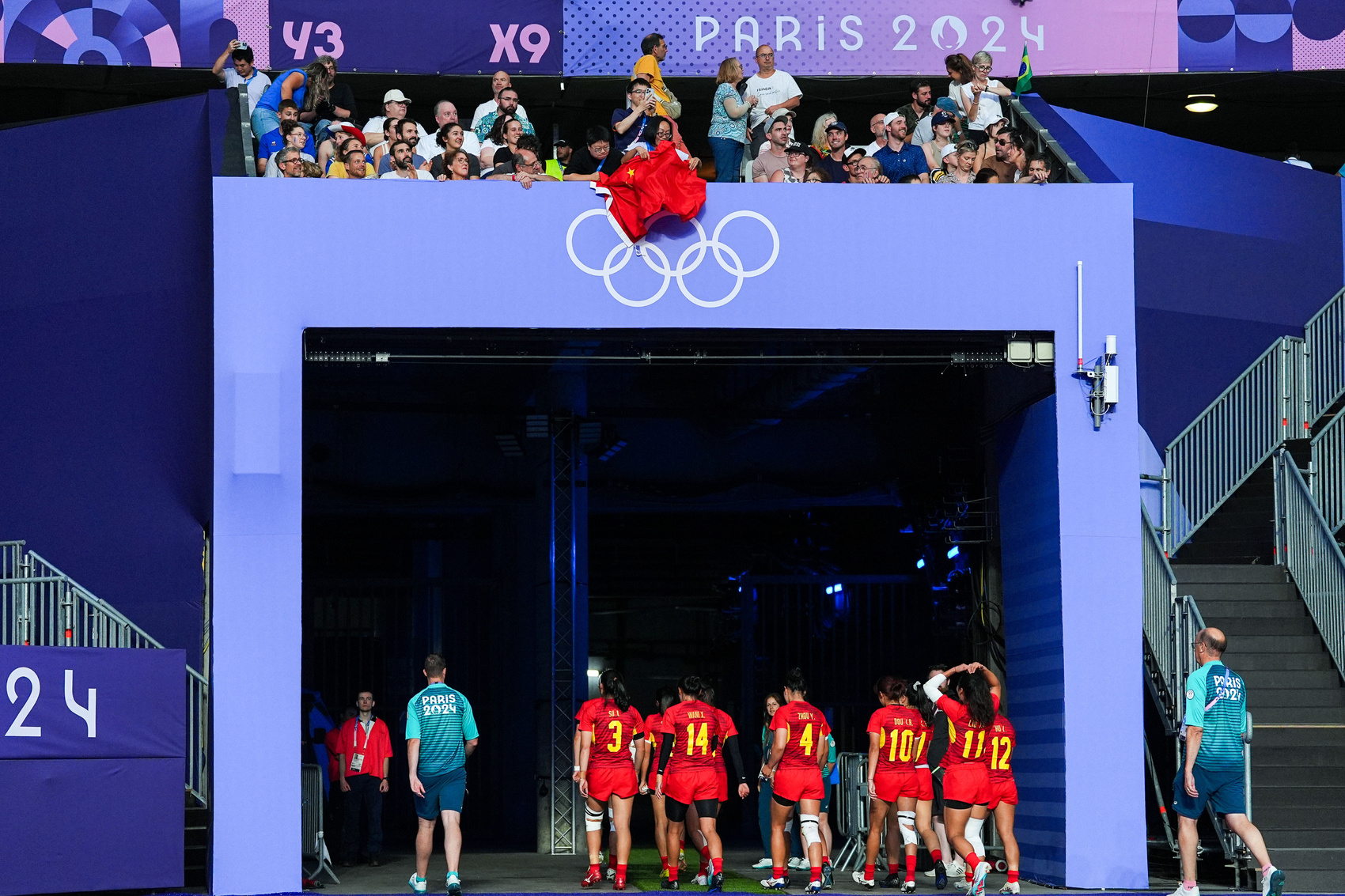 7月29日,中国队选手刘潇倩(右三)在赛后退场时向观众“比心”。当日,在巴黎奥运会七人制橄榄球女子四分之一决赛中,中国队5比55不敌新西兰队。 新华社记者 许畅 摄