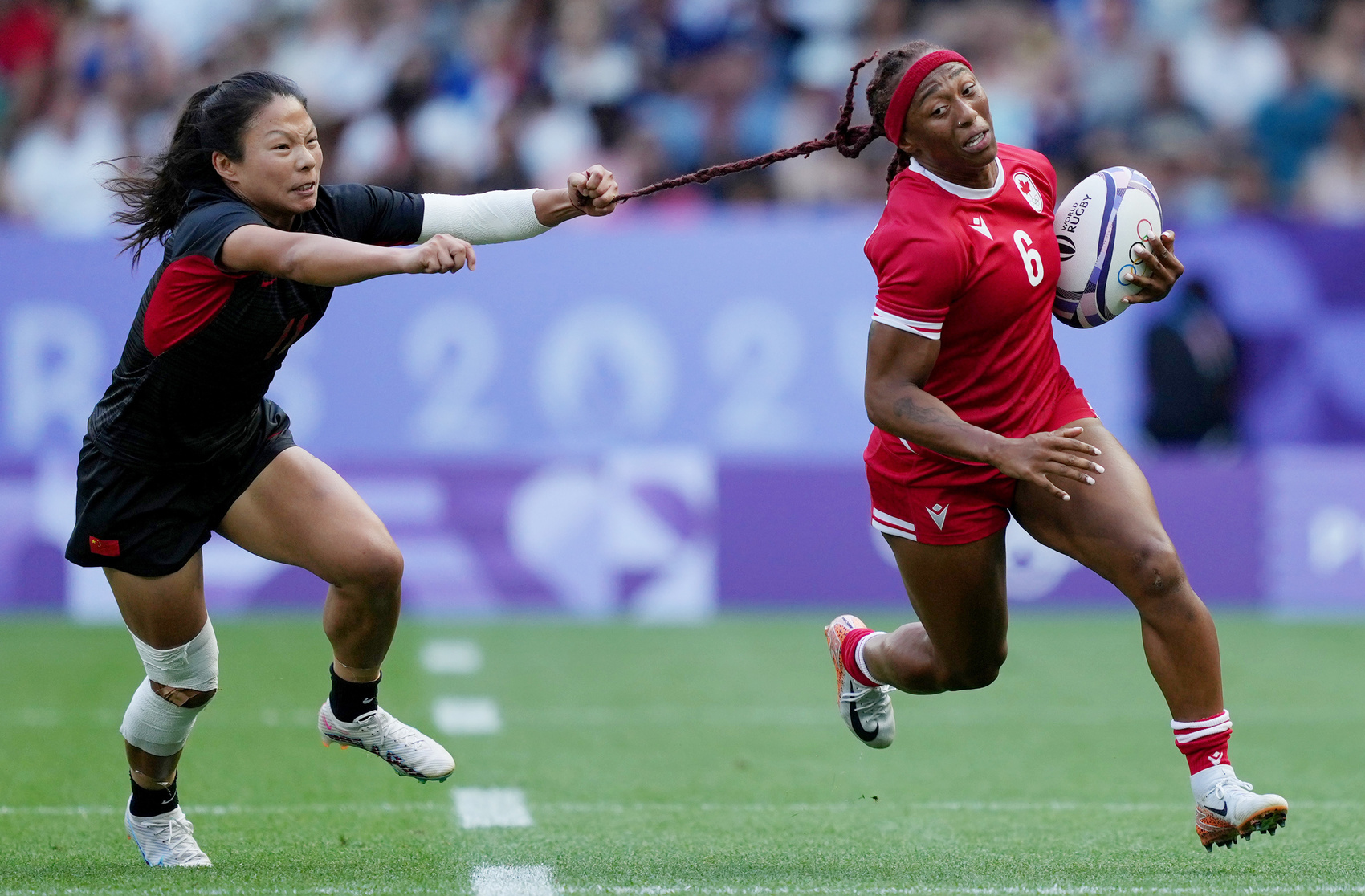 7月29日,中国队球员刘潇倩(左)与加拿大队球员夏丽蒂·威廉姆斯在比赛中。当日,在巴黎奥运会七人制橄榄球女子分组循环赛A组比赛中,中国队17比26不敌加拿大队。 新华社记者 吕小炜 摄
