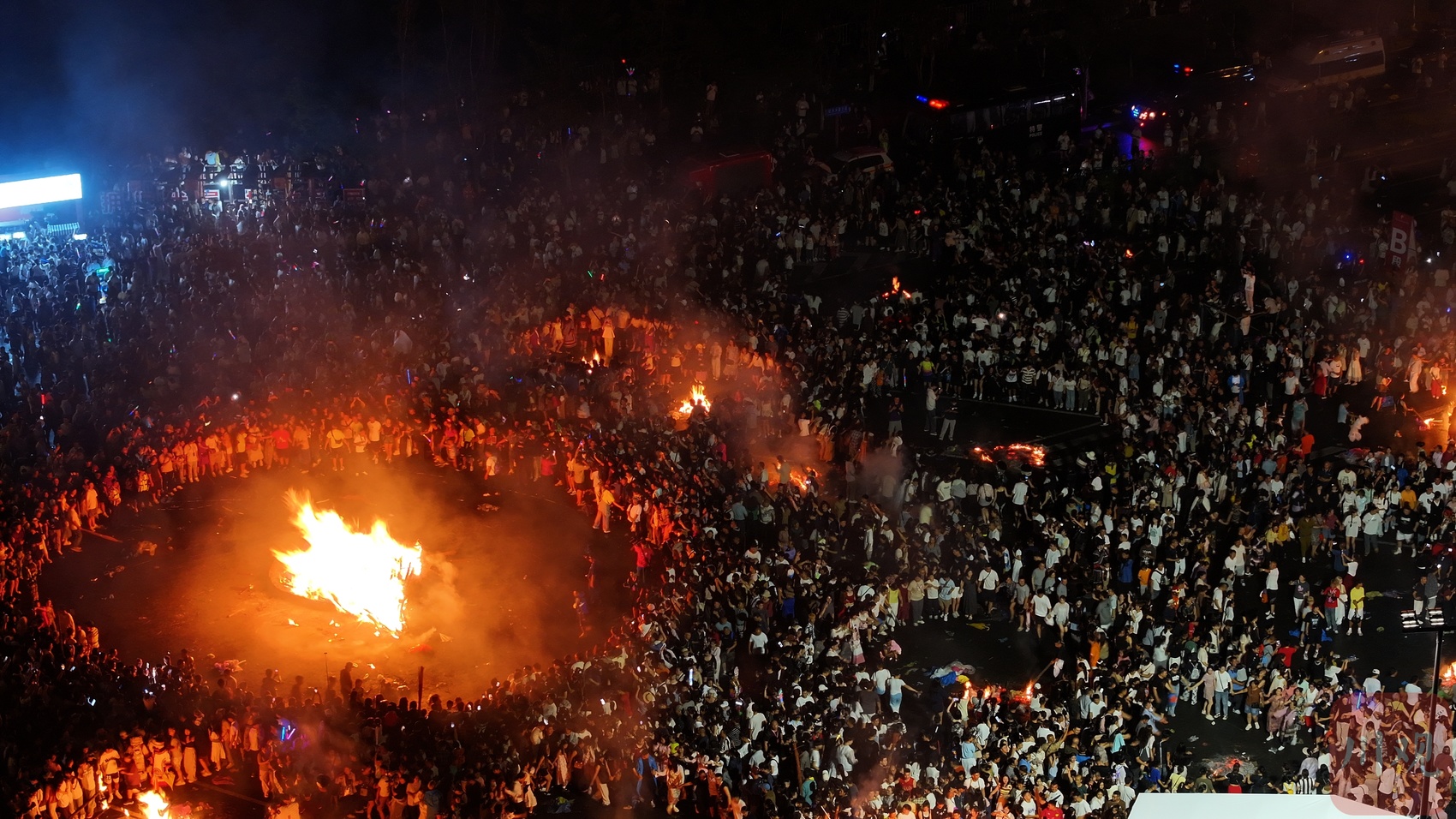 天上繁星点点,地上火把燃烧。在约4.2公里长的西昌市火把狂欢夜主会场,人们将手里的火把伸入火堆中取火,在工作人员的带领下,高举火把,尽情燃烧,那璀璨的火光,照亮了整个夜空,也照亮了人们心中的希望和梦想。