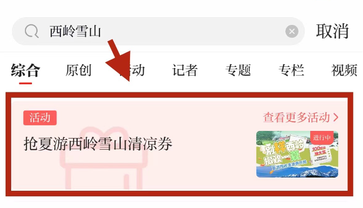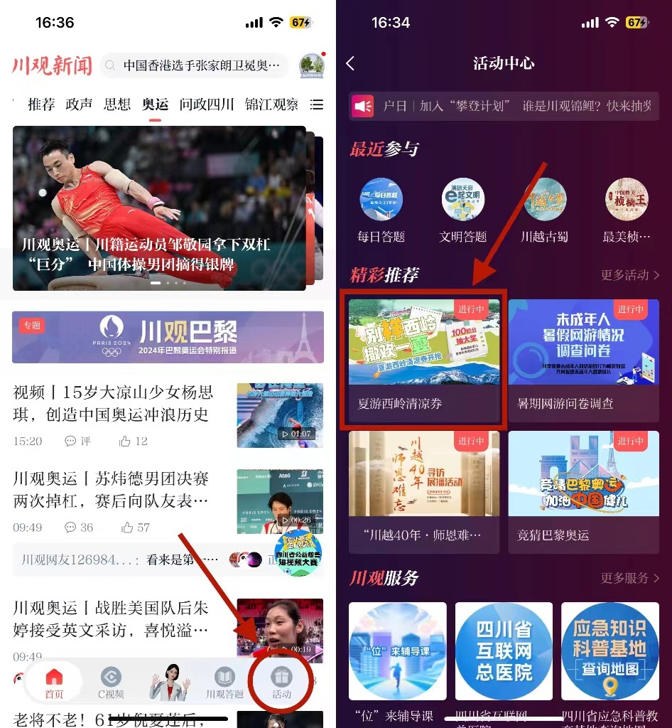 在川观新闻首页,点击右下角“活动”,进入活动中心,找到抢夏游西岭清凉券活动图片,点击即可参与活动;