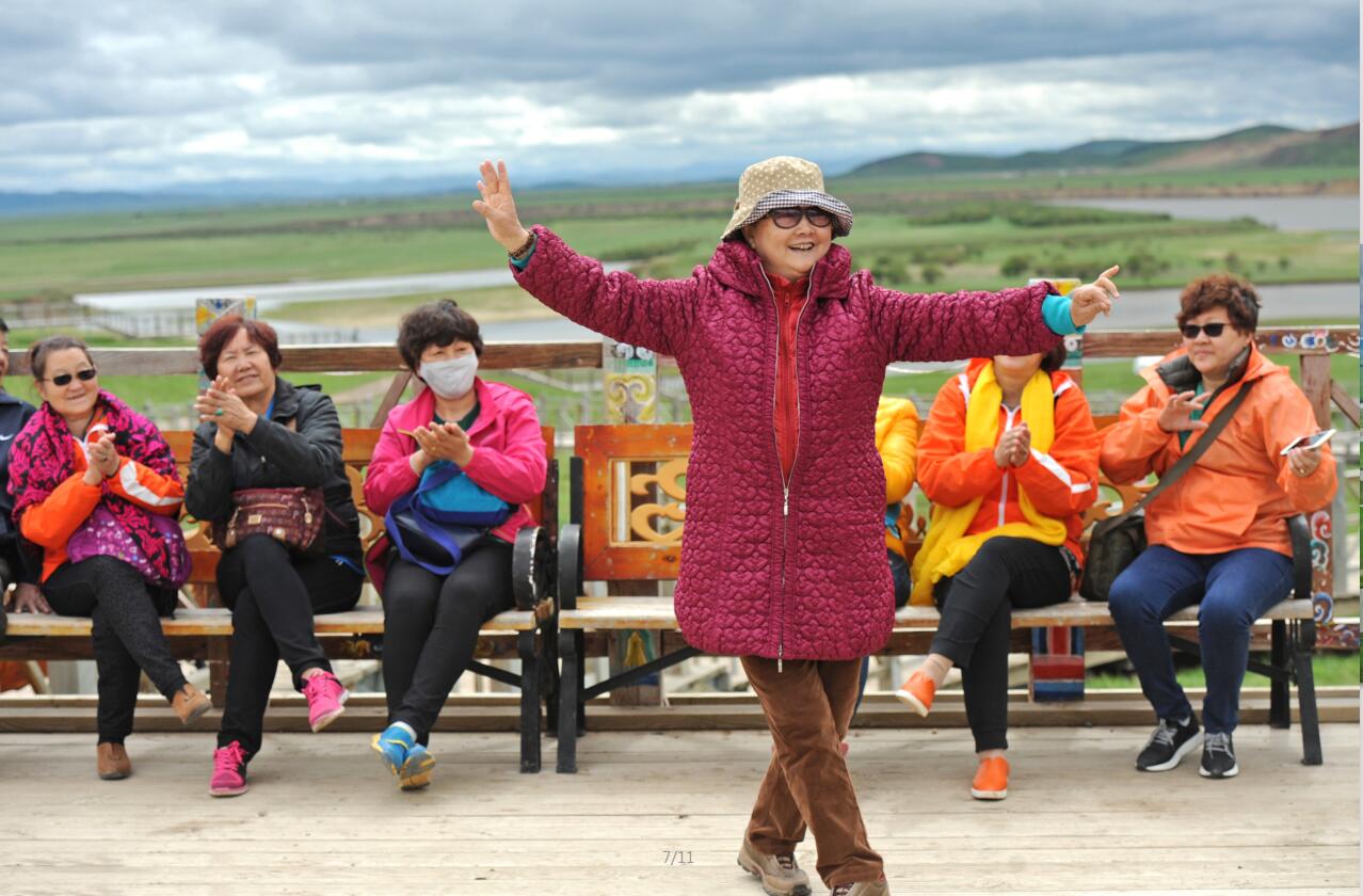 来自新疆的游客被这美如画卷的景色所迷恋,情不自禁地跳起了欢快的舞蹈,表达心中的愉悦。